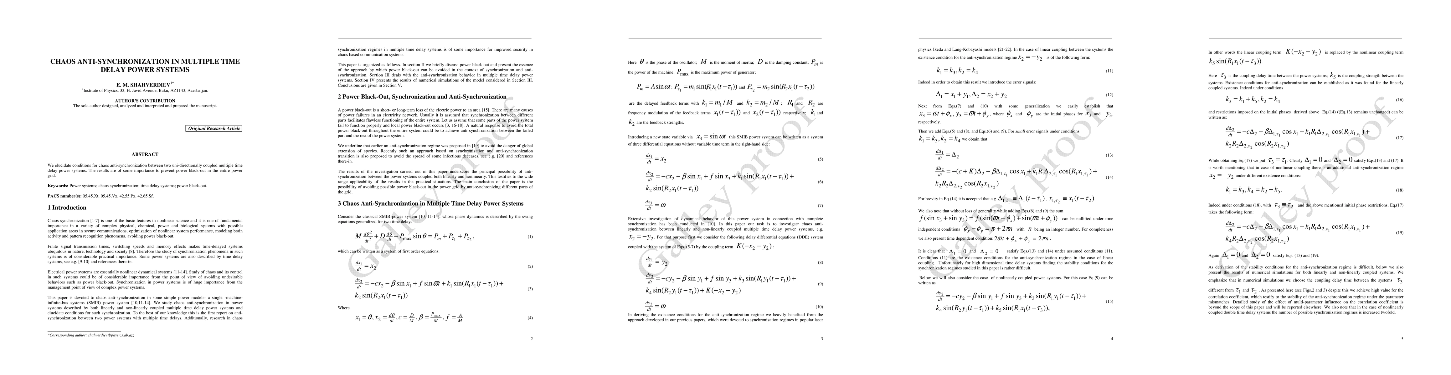 Summary: This paper investigates conditions for chaos anti-synchronization in two coupled multiple time delay power systems, aiming to prevent power blackouts by maintaining grid stability. The findings provide critical insights into managing complex power grid dynamics.