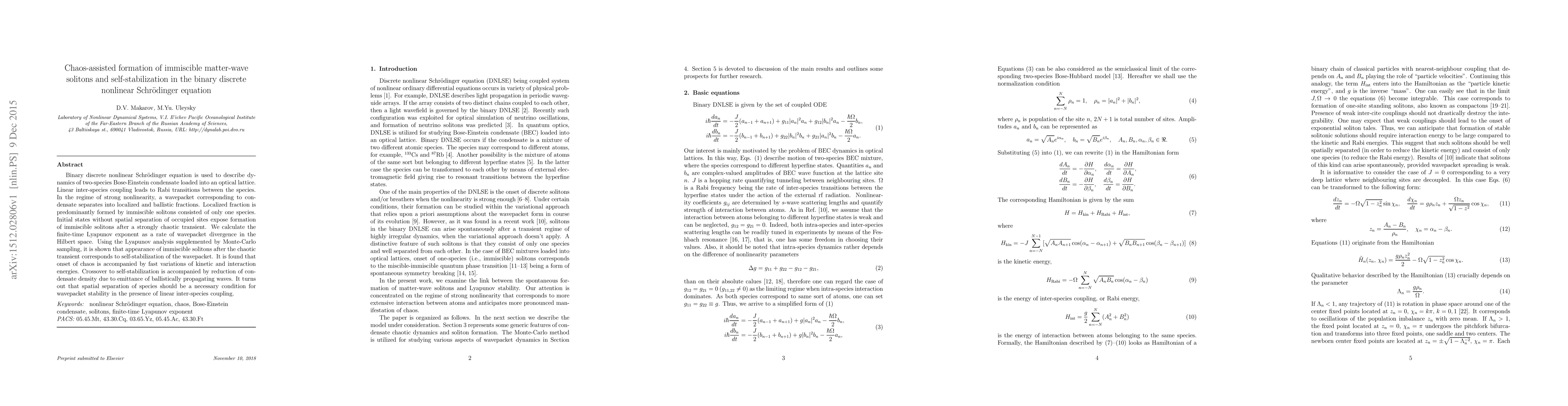 Binary discrete nonlinear Schr\"odinger equation is used to describe dynamics of two-species Bose-Einstein condensate loaded into an optical lattice. Linear inter-species coupling leads to Rabi transitions between the species. In the regime of strong nonlinearity, a wavepacket corresponding to condensate separates into localized and ballistic fractions. Localized fraction is predominantly formed by immiscible solitons consisted of only one species. Initial states without spatial separation of occupied sites expose formation of immiscible solitons after a strongly chaotic transient. We calculate the finite-time Lyapunov exponent as a rate of wavepacket divergence in the Hilbert space. Using the Lyapunov analysis supplemented by Monte-Carlo sampling, it is shown that appearance of immiscible solitons after the chaotic transient corresponds to self-stabilization of the wavepacket. It is found that onset of chaos is accompanied by fast variations of kinetic and interaction energies. Crossover to self-stabilization is accompanied by reduction of condensate density due to emittance of ballistically propagating waves. It turns out that spatial separation of species should be a necessary condition for wavepacket stability in the presence of linear inter-species coupling.