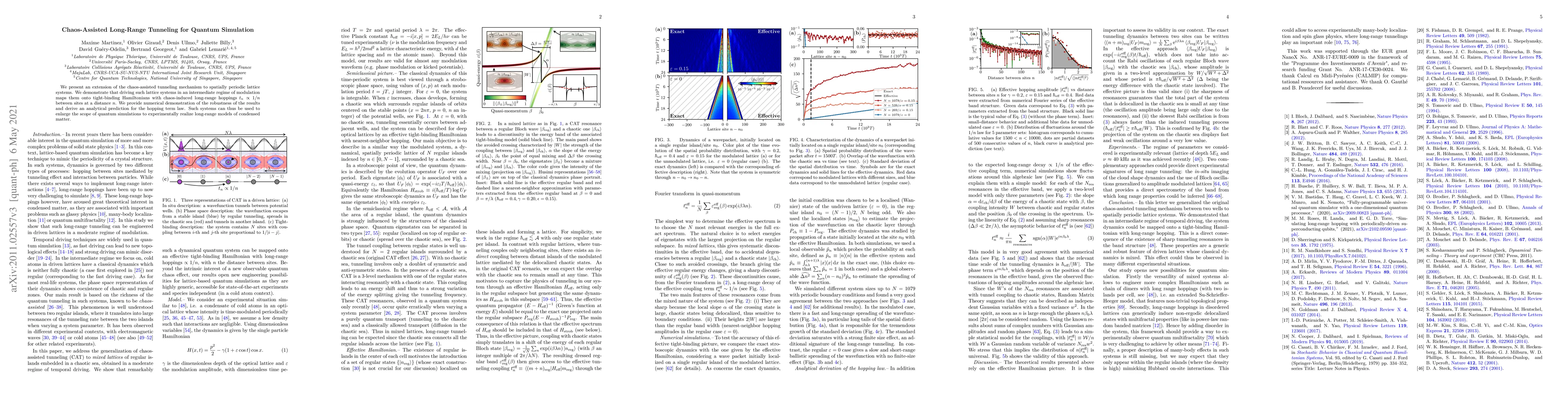 This paper extends chaos-assisted tunneling to periodic lattice systems, showing that intermediate modulation induces long-range hoppings proportional to $1/n$ between distant sites. The robustness of this mechanism is demonstrated numerically, and an analytical prediction for the hopping term is provided, enabling quantum simulations of long-range condensed matter models.
