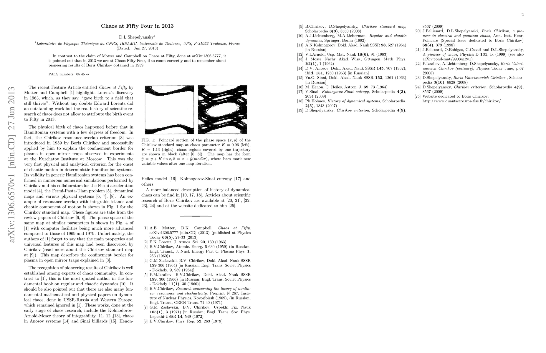 In contrast to the claim of Motter and Campbell on Chaos at Fifty, done at arXiv:1306.5777, it is pointed out that in 2013 we are at Chaos Fifty Four, if to count correctly and to remember about pioneering results of Boris Chirikov obtained in 1959.