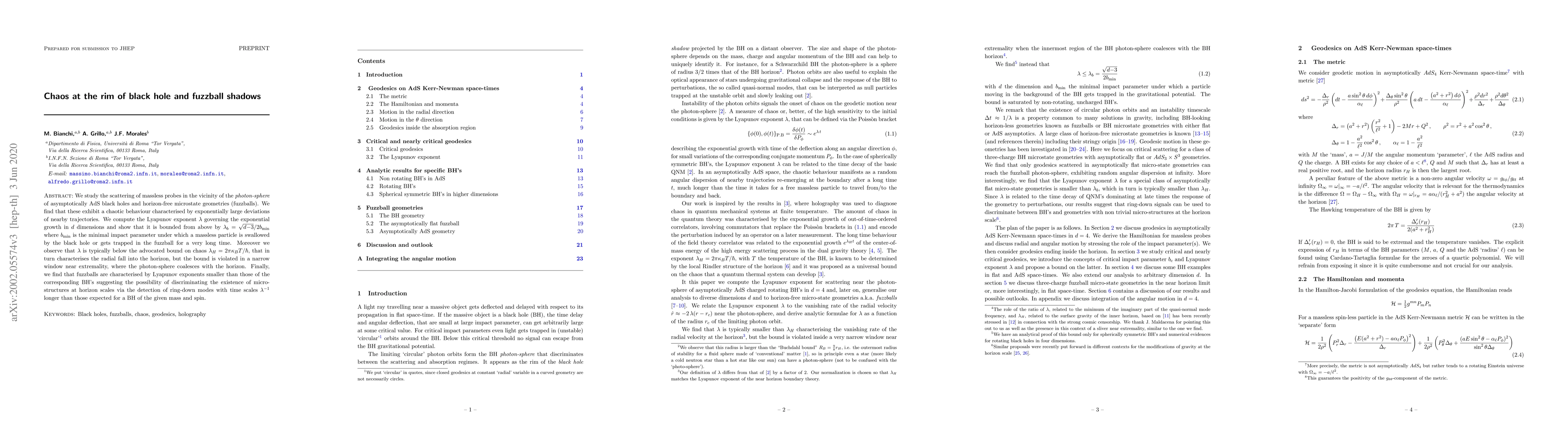 We study the scattering of massless probes in the vicinity of the {\it photon-sphere} of asymptotically AdS black holes and horizon-free microstate geometries (fuzzballs). We find that these exhibit a chaotic behaviour characterised by exponentially large deviations of nearby trajectories. We compute the Lyapunov exponent $\lambda$ governing the exponential growth in $d$ dimensions and show that it is bounded from above by $\lambda_b = \sqrt{d{-}3}/2b_{\rm min}$ where $b_{\rm min}$ is the minimal impact parameter under which a massless particle is swallowed by the black hole or gets trapped in the fuzzball for a very long time. Moreover we observe that $\lambda$ is typically below the advocated bound on chaos $\lambda_H=2\pi \kappa_B T/\hbar$, that in turn characterises the radial fall into the horizon, but the bound is violated in a narrow window near extremality, where the photon-sphere coalesces with the horizon. Finally, we find that fuzzballs are characterised by Lyapunov exponents smaller than those of the corresponding BH's suggesting the possibility of discriminating the existence of micro-structures at horizon scales via the detection of ring-down modes with time scales $\lambda^{-1}$ longer than those expected for a BH of the given mass and spin.
