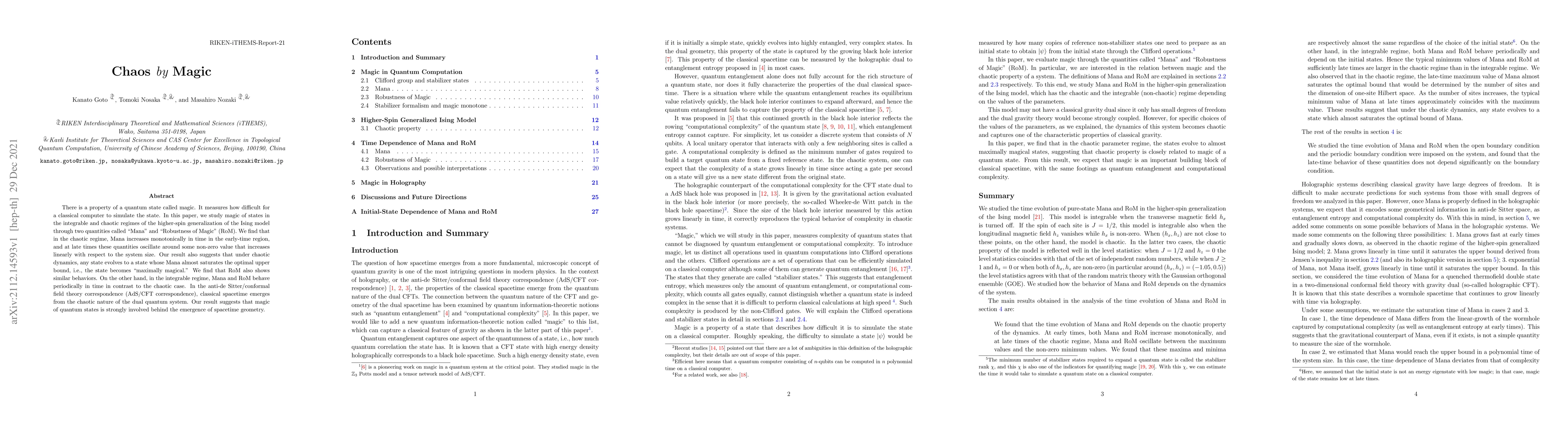 There is a property of a quantum state called magic. It measures how difficult for a classical computer to simulate the state. In this paper, we study magic of states in the integrable and chaotic regimes of the higher-spin generalization of the Ising model through two quantities called "Mana" and "Robustness of Magic" (RoM). We find that in the chaotic regime, Mana increases monotonically in time in the early-time region, and at late times these quantities oscillate around some non-zero value that increases linearly with respect to the system size. Our result also suggests that under chaotic dynamics, any state evolves to a state whose Mana almost saturates the optimal upper bound, i.e., the state becomes "maximally magical." We find that RoM also shows similar behaviors. On the other hand, in the integrable regime, Mana and RoM behave periodically in time in contrast to the chaotic case. In the anti-de Sitter/conformal field theory correspondence (AdS/CFT correspondence), classical spacetime emerges from the chaotic nature of the dual quantum system. Our result suggests that magic of quantum states is strongly involved behind the emergence of spacetime geometry.