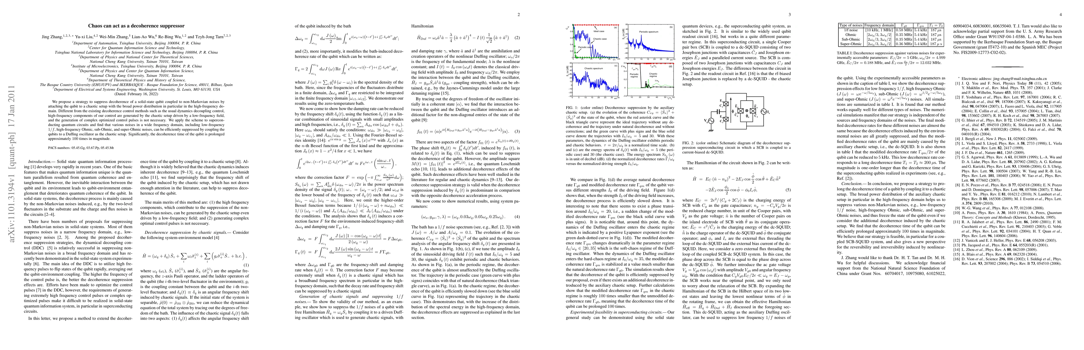 This paper proposes a novel method to suppress decoherence in solid-state qubits by coupling them to a chaotic setup, specifically a Duffing oscillator, which effectively mitigates various noise types across a wide frequency range, significantly extending the qubit's decoherence time by approximately 100 times. Unlike traditional decoupling methods, this approach does not require complex optimized control pulses.