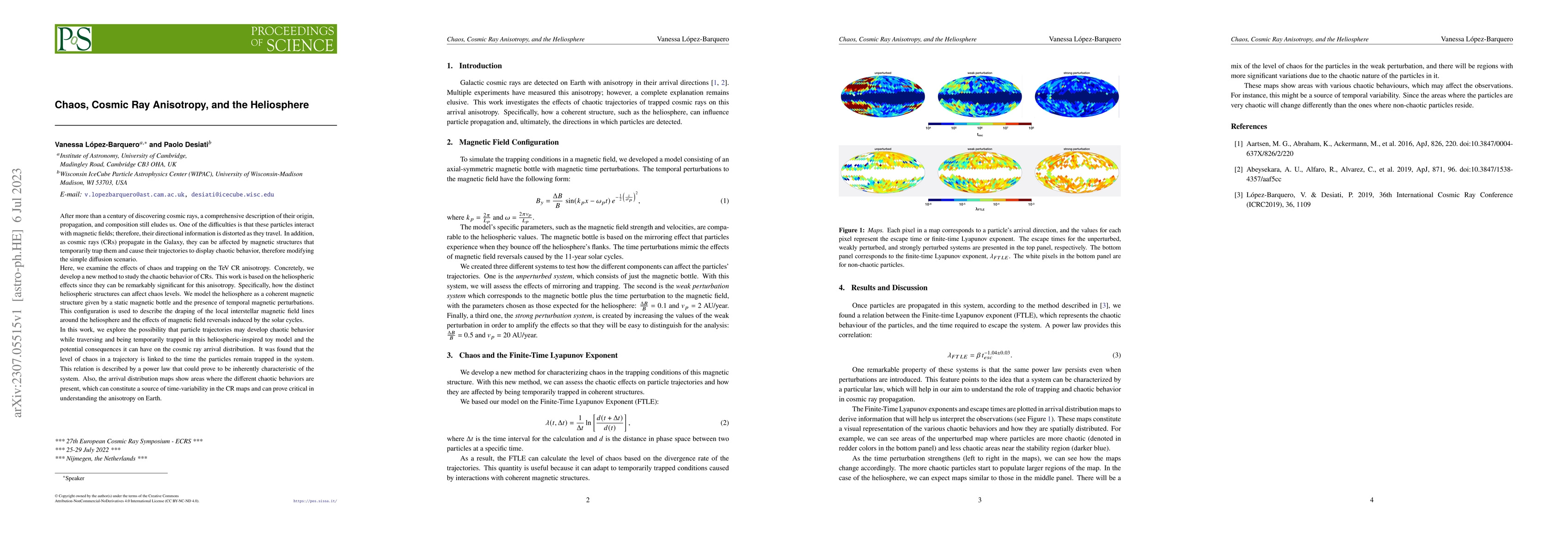 After more than a century of discovering cosmic rays, a comprehensive description of their origin, propagation, and composition still eludes us. One of the difficulties is that these particles interact with magnetic fields; therefore, their directional information is distorted as they travel. In addition, as cosmic rays (CRs) propagate in the Galaxy, they can be affected by magnetic structures that temporarily trap them and cause their trajectories to display chaotic behavior, therefore modifying the simple diffusion scenario. Here, we examine the effects of chaos and trapping on the TeV CR anisotropy. Concretely, we develop a new method to study the chaotic behavior of CRs. This work is based on the heliospheric effects since they can be remarkably significant for this anisotropy. Specifically, how the distinct heliospheric structures can affect chaos levels. We model the heliosphere as a coherent magnetic structure given by a static magnetic bottle and the presence of temporal magnetic perturbations. This configuration is used to describe the draping of the local interstellar magnetic field lines around the heliosphere and the effects of magnetic field reversals induced by the solar cycles. In this work, we explore the possibility that particle trajectories may develop chaotic behavior while traversing and being temporarily trapped in this heliospheric-inspired toy model and its potential consequences on the CR arrival distribution. It was found that the level of chaos in a trajectory is linked to the time the particles remain trapped in the system. This relation is described by a power law that could prove to be inherently characteristic of the system. Also, the arrival distribution maps show areas where the different chaotic behaviors are present, which can constitute a source of time-variability in the CR maps and can prove critical in understanding the anisotropy on Earth.
