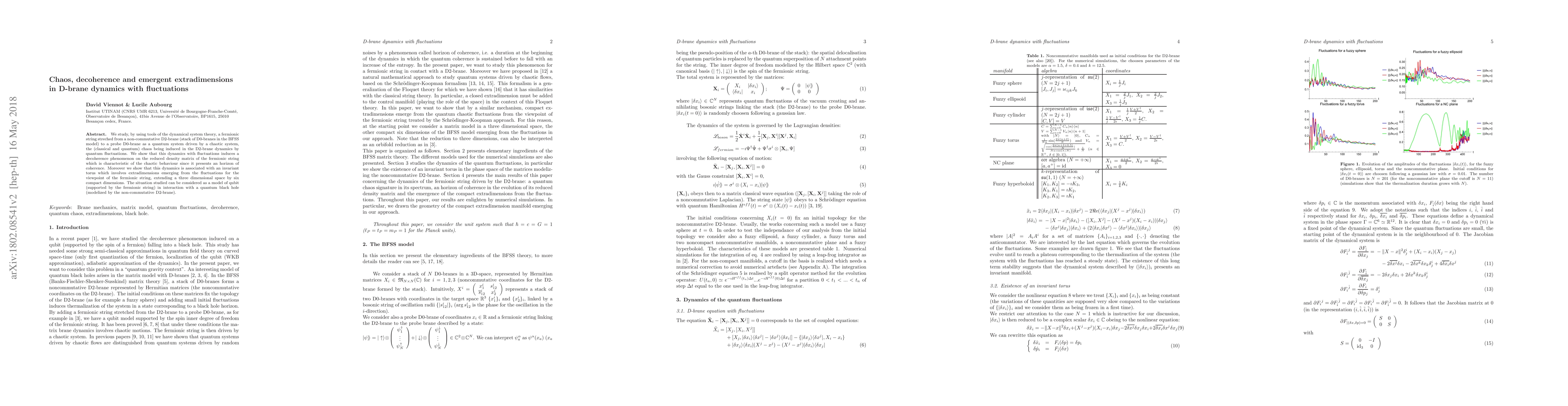 We study, by using tools of the dynamical system theory, a fermionic string streched from a non-commutative D2-brane (stack of D0-branes in the BFSS model) to a probe D0-brane as a quantum system driven by a chaotic system, the (classical and quantum) chaos being induced in the D2-brane dynamics by quantum fluctuations. We show that this dynamics with fluctuations induces a decoherence phenomenon on the reduced density matrix of the fermionic string which is characteristic of the chaotic behaviour since it presents an horizon of coherence. Moreover we show that this dynamics is associated with an invariant torus which involves extradimensions emerging from the fluctuations for the viewpoint of the fermionic string, extending a three dimensional space by six compact dimensions. The situation studied can be considered as a model of qubit (supported by the fermionic string) in interaction with a quantum black hole (modelized by the non-commutative D2-brane).