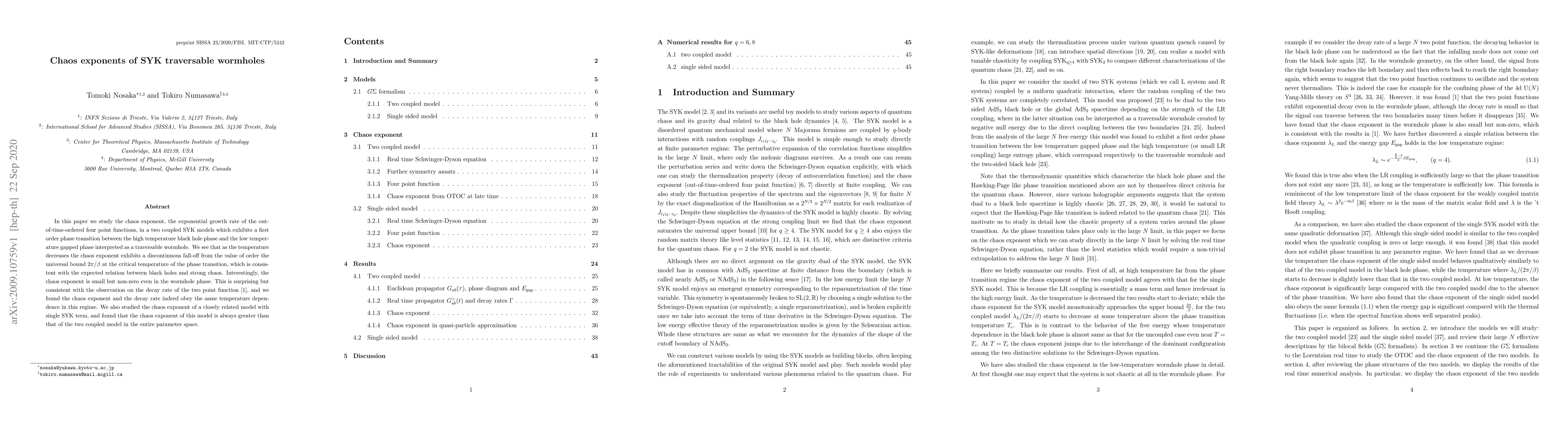 This paper investigates the chaos exponent in coupled SYK models undergoing a phase transition between a black hole and a traversable wormhole phase. It finds that the chaos exponent drops discontinuously at the transition and remains small but non-zero in the wormhole phase, consistent with the decay rate of two-point functions. Additionally, a single SYK term model shows a consistently higher chaos exponent compared to the coupled model.