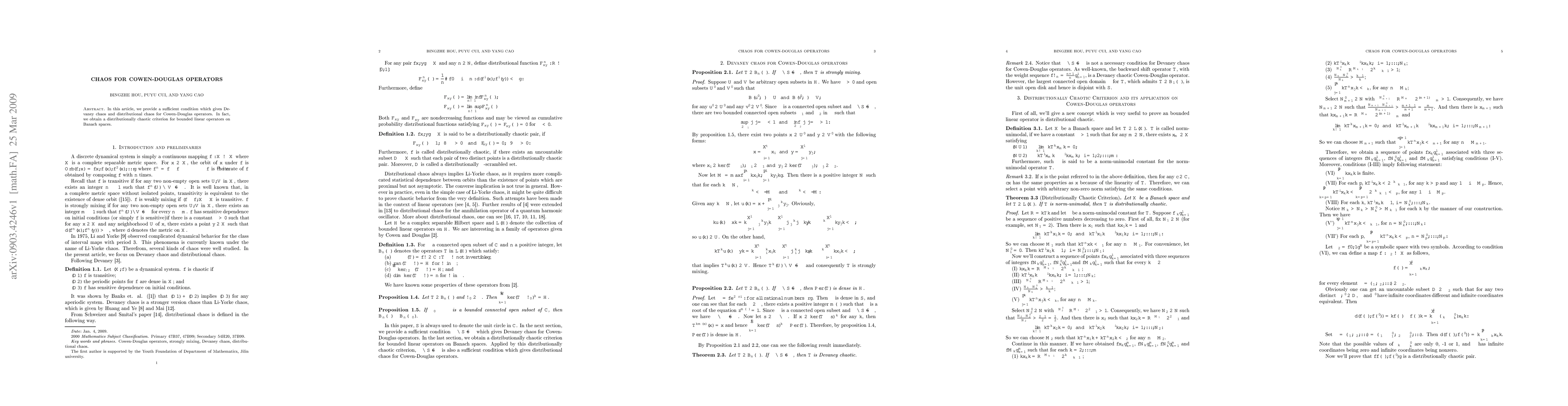 This paper establishes a sufficient condition for Cowen-Douglas operators to exhibit Devaney chaos and distributional chaos. It also provides a criterion for bounded linear operators on Banach spaces to achieve distributional chaos.