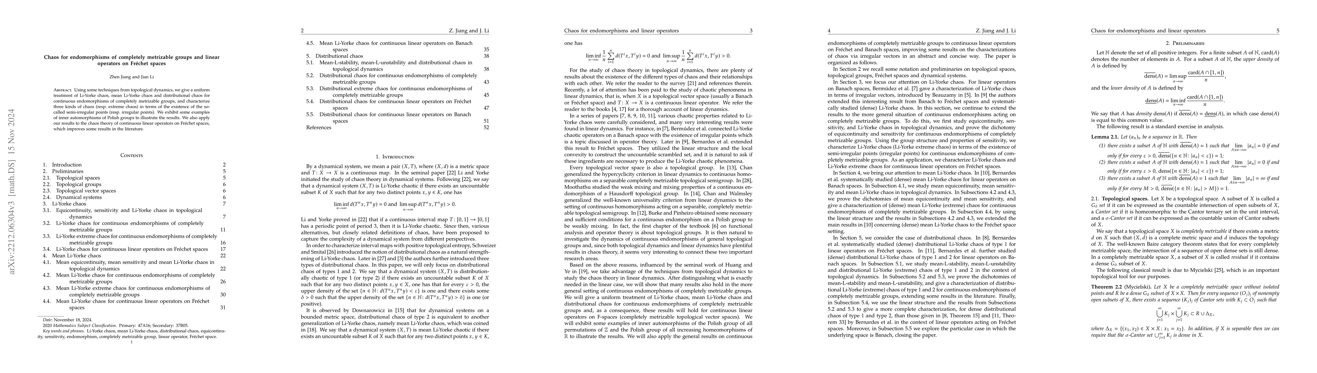 This paper employs topological dynamics to analyze chaos in endomorphisms of completely metrizable groups and linear operators on Fréchet spaces, characterizing various types of chaos through the existence of specific points. It also extends these findings to improve existing results in chaos theory for linear operators.