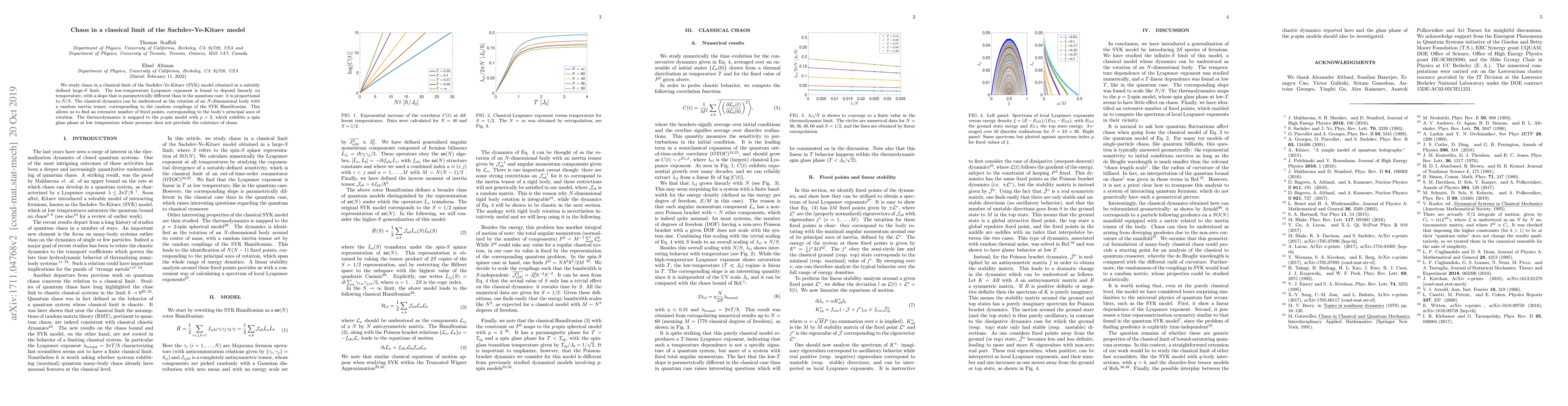 We study chaos in a classical limit of the Sachdev-Ye-Kitaev (SYK) model obtained in a suitably defined large-S limit. The low-temperature Lyapunov exponent is found to depend linearly on temperature, with a slope that is parametrically different than in the quantum case: it is proportional to N/S. The classical dynamics can be understood as the rotation of an N-dimensional body with a random inertia tensor, corresponding to the random couplings of the SYK Hamiltonian. This allows us to find an extensive number of fixed points, corresponding to the body's principal axes of rotation. The thermodynamics is mapped to the p-spin model with p=2, which exhibits a spin glass phase at low temperature whose presence does not preclude the existence of chaos.