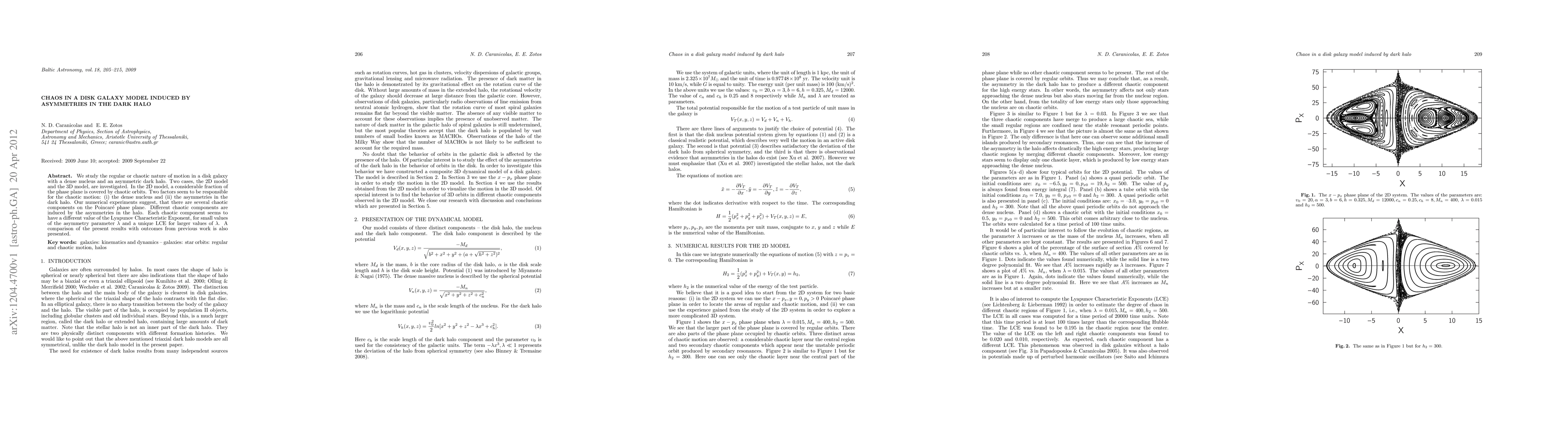 A study investigates chaotic motion in disk galaxies with dense nuclei and asymmetric dark halos, finding that asymmetries induce multiple chaotic components on the phase plane.