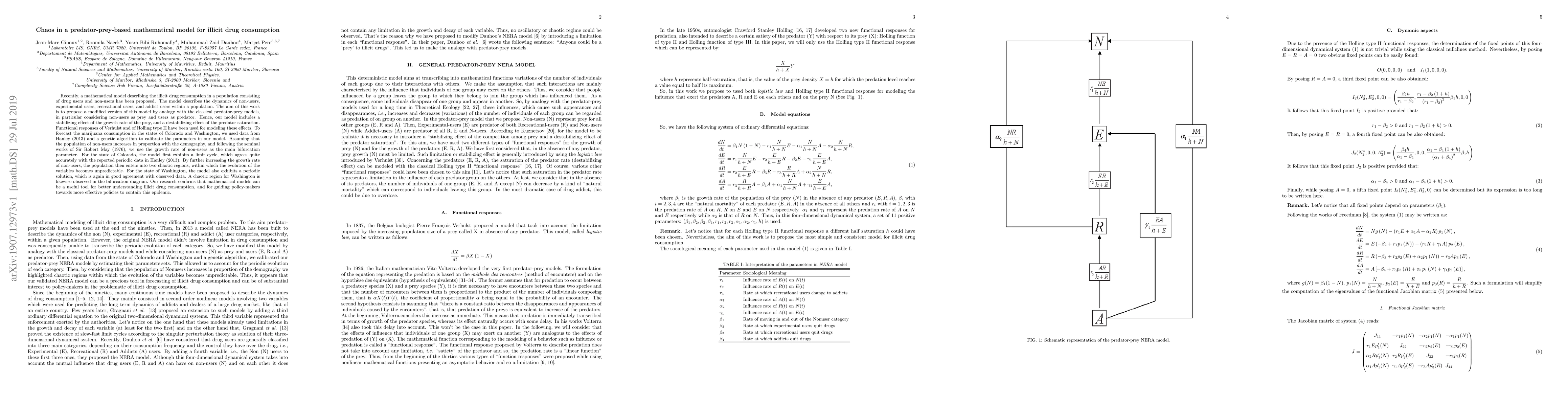 Recently, a mathematical model describing the illicit drug consumption in a population consisting of drug users and non-users has been proposed. The model describes the dynamics of non-users, experimental users, recreational users, and addict users within a population. The aim of this work is to propose a modified version of this model by analogy with the classical predator-prey models, in particular considering non-users as prey and users as predator. Hence, our model includes a stabilizing effect of the growth rate of the prey, and a destabilizing effect of the predator saturation. Functional responses of Verhulst and of Holling type II have been used for modeling these effects. To forecast the marijuana consumption in the states of Colorado and Washington, we used data from Hanley (2013) and a genetic algorithm to calibrate the parameters in our model. Assuming that the population of non-users increases in proportion with the demography, and following the seminal works of Sir Robert May (1976), we use the growth rate of non-users as the main bifurcation parameter. For the state of Colorado, the model first exhibits a limit cycle, which agrees quite accurately with the reported periodic data in Hanley (2013). By further increasing the growth rate of non-users, the population then enters into two chaotic regions, within which the evolution of the variables becomes unpredictable. For the state of Washington, the model also exhibits a periodic solution, which is again in good agreement with observed data. A chaotic region for Washington is likewise observed in the bifurcation diagram. Our research confirms that mathematical models can be a useful tool for better understanding illicit drug consumption, and for guiding policy-makers towards more effective policies to contain this epidemic.