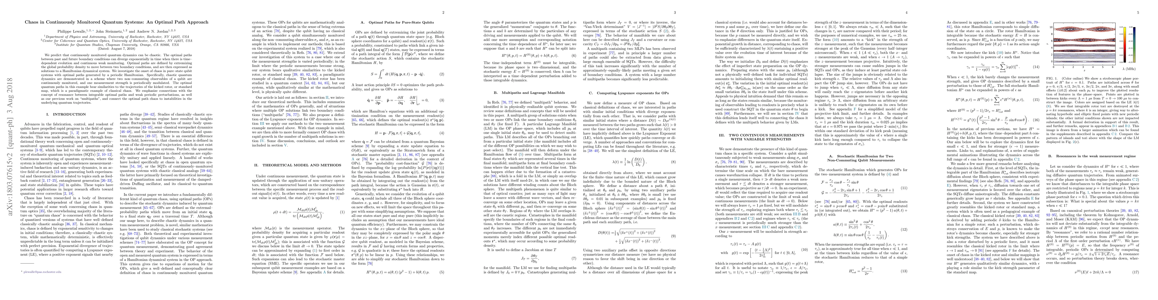 We predict that continuously monitored quantum dynamics can be chaotic. The optimal paths between past and future boundary conditions can diverge exponentially in time when there is time-dependent evolution and continuous weak monitoring. Optimal paths are defined by extremizing the global probability density to move between two boundary conditions. We investigate the onset of chaos in pure-state qubit systems with optimal paths generated by a periodic Hamiltonian. Specifically, chaotic quantum dynamics are demonstrated in a scheme where two non-commuting observables of a qubit are continuously monitored, and one measurement strength is periodically modulated. The optimal quantum paths in this example bear similarities to the trajectories of the kicked rotor, or standard map, which is a paradigmatic example of classical chaos. We emphasize connections with the concept of resonance between integrable optimal paths and weak periodic perturbations, as well as our previous work on "multipaths", and connect the optimal path chaos to instabilities in the underlying quantum trajectories.