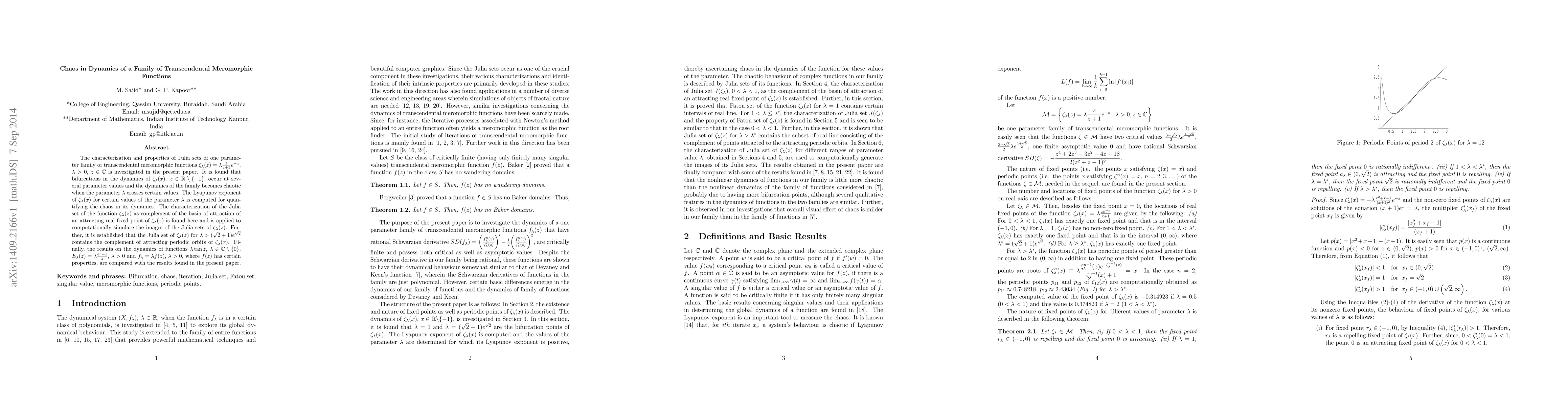 The characterization and properties of Julia sets of one parameter family of transcendental meromorphic functions $\zeta_\lambda(z)=\lambda \frac{z}{z+1} e^{-z}$, $\lambda >0$, $z\in \mathbb{C}$ is investigated in the present paper. It is found that bifurcations in the dynamics of $\zeta_\lambda(x)$, $x\in {\mathbb{R}}\setminus \{-1\}$, occur at several parameter values and the dynamics of the family becomes chaotic when the parameter $\lambda$ crosses certain values. The Lyapunov exponent of $\zeta_\lambda(x)$ for certain values of the parameter $\lambda$ is computed for quantifying the chaos in its dynamics. The characterization of the Julia set of the function $\zeta_\lambda(z)$ as complement of the basin of attraction of an attracting real fixed point of $\zeta_\lambda(z)$ is found here and is applied to computationally simulate the images of the Julia sets of $\zeta_\lambda(z)$. Further, it is established that the Julia set of $\zeta_\lambda(z)$ for $\lambda>(\sqrt{2}+1) e^{\sqrt{2}}$ contains the complement of attracting periodic orbits of $\zeta_\lambda(x)$. Finally, the results on the dynamics of functions $\lambda \tan z$, $\lambda \in {\mathbb{\hat{C}}}\setminus\{0\}$, $E_{\lambda}(z) = \lambda \frac{e^{z} -1}{z}$, $\lambda > 0$ and $f_{\lambda}=\lambda f(z)$, $\lambda>0$, where $f(z)$ has certain properties, are compared with the results found in the present paper.