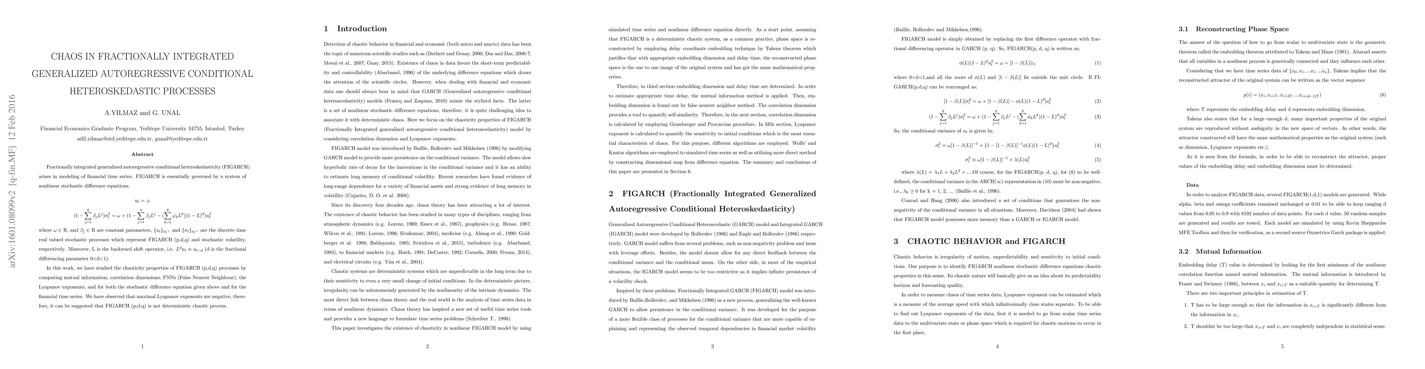 Fractionally integrated generalized autoregressive conditional heteroskedasticity (FIGARCH) arises in modeling of financial time series. FIGARCH is essentially governed by a system of nonlinear stochastic difference equations ${u_t}$ = ${z_t}$ $(1-\sum\limits_{j=1}^q \beta_j L^j)\sigma_{t}^2 = \omega+(1-\sum\limits_{j=1}^q \beta_j L^j - (\sum\limits_{k=1}^p \varphi_k L^k) (1-L)^d) u_t^2$, where $\omega\in$ R, and $\beta_j\in$ R are constant parameters, $\{u_t\}_{{t\in}^+}$ and $\{\sigma_t\}_{{t\in}^+}$ are the discrete time real valued stochastic processes which represent FIGARCH (p,d,q) and stochastic volatility, respectively. Moreover, L is the backward shift operator, i.e. $L^d u_t \equiv u_{t-d}$ (d is the fractional differencing parameter 0$<$d$<$1). In this work, we have studied the chaoticity properties of FIGARCH (p,d,q) processes by computing mutual information, correlation dimensions, FNNs (False Nearest Neighbour), the Lyapunov exponents, and for both the stochastic difference equation given above and for the financial time series. We have observed that maximal Lyapunov exponents are negative, therefore, it can be suggested that FIGARCH (p,d,q) is not deterministic chaotic process.