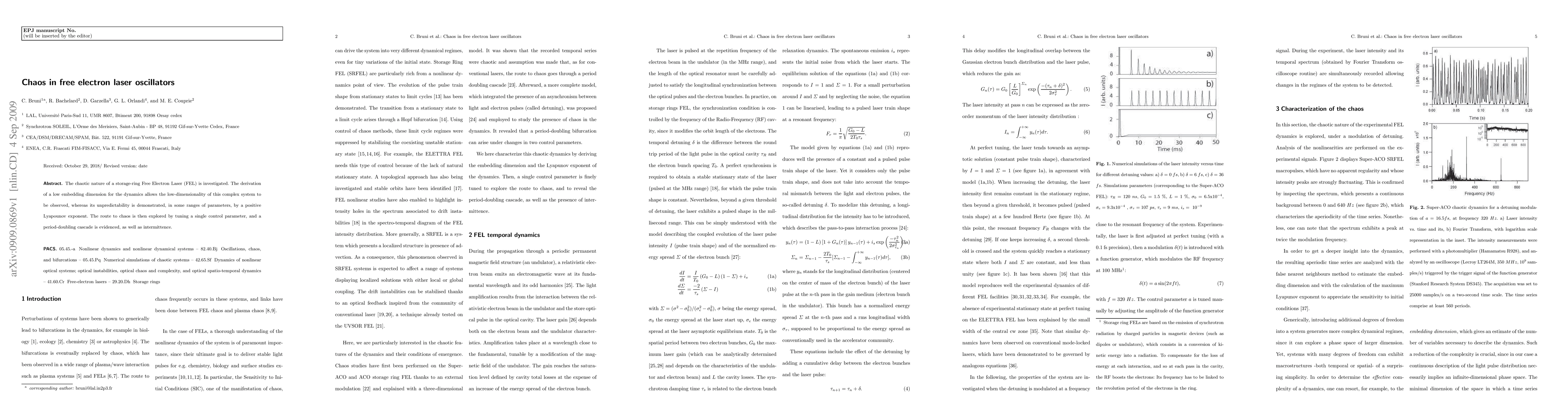 This paper investigates the chaotic dynamics in a storage-ring Free Electron Laser (FEL), revealing its low-dimensional complexity and unpredictability through positive Lyapounov exponent. The study explores the route to chaos via parameter tuning, identifying period-doubling cascades and intermittence.