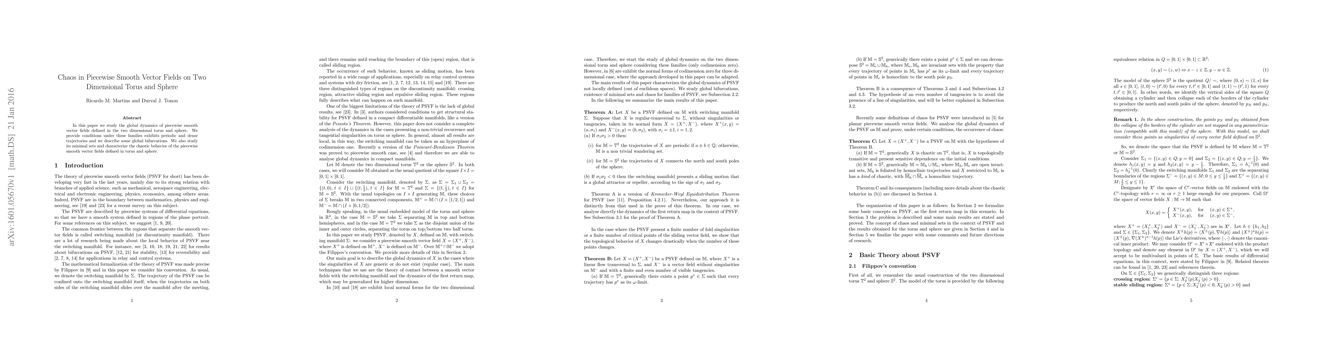 This paper investigates the global dynamics of piecewise smooth vector fields on the two-dimensional torus and sphere, focusing on periodic and dense trajectories, global bifurcations, and chaotic behavior, including the characterization of minimal sets.