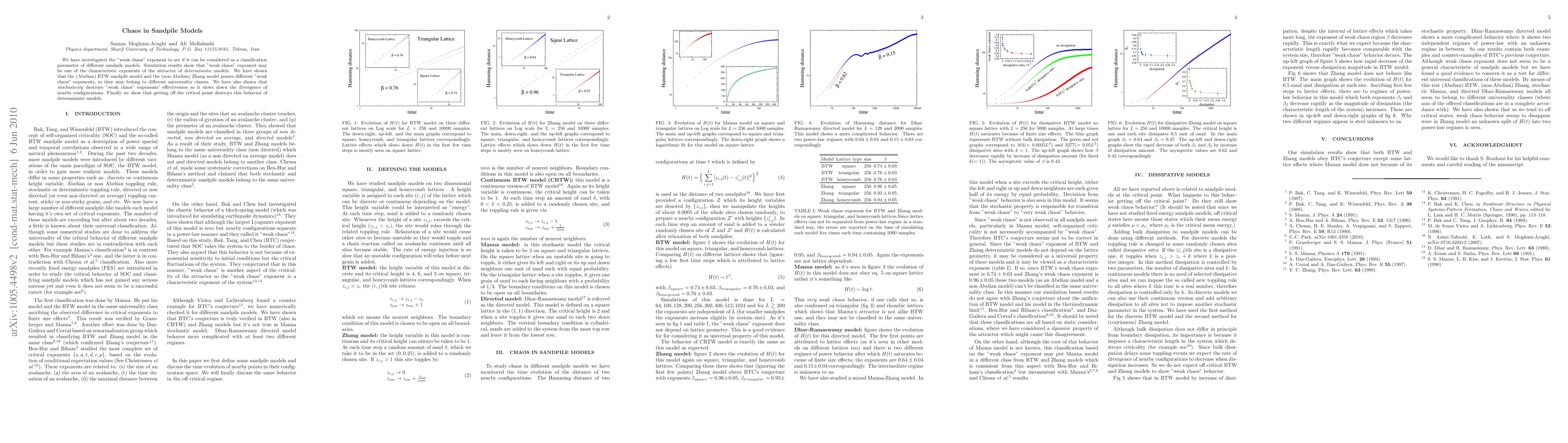 We have investigated the "weak chaos" exponent to see if it can be considered as a classification parameter of different sandpile models. Simulation results show that "weak chaos" exponent may be one of the characteristic exponents of the attractor of \textit{deterministic} models. We have shown that the (abelian) BTW sandpile model and the (non abelian) Zhang model posses different "weak chaos" exponents, so they may belong to different universality classes. We have also shown that \textit{stochasticity} destroys "weak chaos" exponents' effectiveness so it slows down the divergence of nearby configurations. Finally we show that getting off the critical point destroys this behavior of deterministic models.