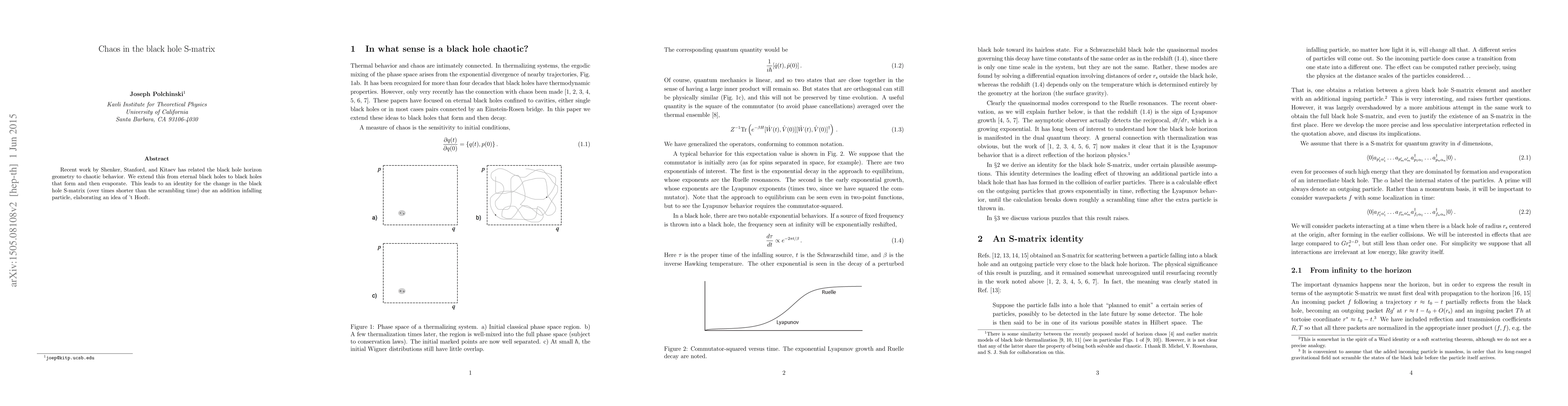 Recent work by Shenker, Stanford, and Kitaev has related the black hole horizon geometry to chaotic behavior. We extend this from eternal black holes to black holes that form and then evaporate. This leads to an identity for the change in the black hole S-matrix (over times shorter than the scrambling time) due an addition infalling particle, elaborating an idea of 't Hooft.