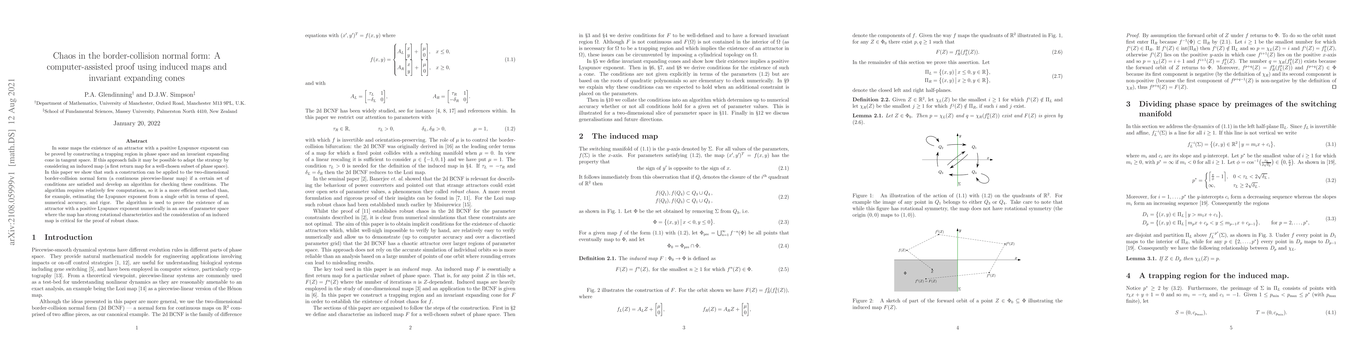 In some maps the existence of an attractor with a positive Lyapunov exponent can be proved by constructing a trapping region in phase space and an invariant expanding cone in tangent space. If this approach fails it may be possible to adapt the strategy by considering an induced map (a first return map for a well-chosen subset of phase space). In this paper we show that such a construction can be applied to the two-dimensional border-collision normal form (a continuous piecewise-linear map) if a certain set of conditions are satisfied and develop an algorithm for checking these conditions. The algorithm requires relatively few computations, so it is a more efficient method than, for example, estimating the Lyapunov exponent from a single orbit in terms of speed, numerical accuracy, and rigor. The algorithm is used to prove the existence of an attractor with a positive Lyapunov exponent numerically in an area of parameter space where the map has strong rotational characteristics and the consideration of an induced map is critical for the proof of robust chaos.