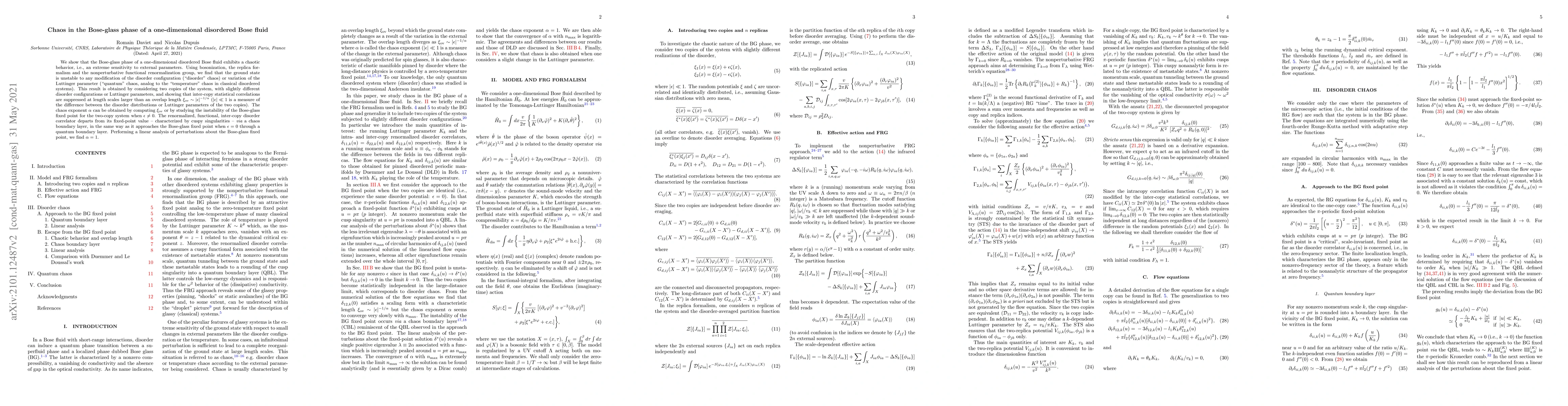 We show that the Bose-glass phase of a one-dimensional disordered Bose fluid exhibits a chaotic behavior, i.e., an extreme sensitivity to external parameters. Using bosonization, the replica formalism and the nonperturbative functional renormalization group, we find that the ground state is unstable to any modification of the disorder configuration ("disorder" chaos) or variation of the Luttinger parameter ("quantum" chaos, analog to the "temperature" chaos in classical disordered systems). This result is obtained by considering two copies of the system, with slightly different disorder configurations or Luttinger parameters, and showing that inter-copy statistical correlations are suppressed at length scales larger than an overlap length $\xi_{\mathrm{ov}}\sim |\epsilon|^{-1/\alpha}$ ($|\epsilon|\ll 1$ is a measure of the difference between the disorder distributions or Luttinger parameters of the two copies). The chaos exponent $\alpha$ can be obtained by computing $\xi_{\mathrm{ov}}$ or by studying the instability of the Bose-glass fixed point for the two-copy system when $\epsilon\neq 0$. The renormalized, functional, inter-copy disorder correlator departs from its fixed-point value -- characterized by cuspy singularities -- via a chaos boundary layer, in the same way as it approaches the Bose-glass fixed point when $\epsilon=0$ through a quantum boundary layer. Performing a linear analysis of perturbations about the Bose-glass fixed point, we find $\alpha=1$.