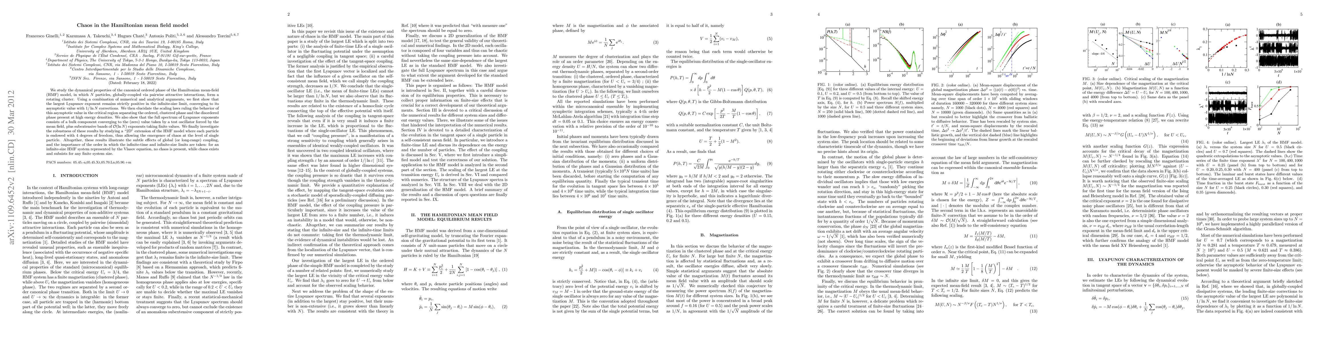 We study the dynamical properties of the canonical ordered phase of the Hamiltonian mean-field (HMF) model, in which $N$ particles, globally-coupled via pairwise attractive interactions, form a rotating cluster. Using a combination of numerical and analytical arguments, we first show that the largest Lyapunov exponent remains strictly positive in the infinite-size limit, converging to its asymptotic value with $1/\ln N$ corrections. We then elucidate the scaling laws ruling the behavior of this asymptotic value in the critical region separating the ordered, clustered phase and the disordered phase present at high energy densities. We also show that the full spectrum of Lyapunov exponents consists of a bulk component converging to the (zero) value taken by a test oscillator forced by the mean field, plus subextensive bands of ${\cal O}(\ln N)$ exponents taking finite values. We finally investigate the robustness of these results by studying a "2D" extension of the HMF model where each particle is endowed with 4 degrees of freedom, thus allowing the emergence of chaos at the level of single particle. Altogether, these results illustrate the subtle effects of global (or long-range) coupling, and the importance of the order in which the infinite-time and infinite-size limits are taken: for an infinite-size HMF system represented by the Vlasov equation, no chaos is present, while chaos exists and subsists for any finite system size.