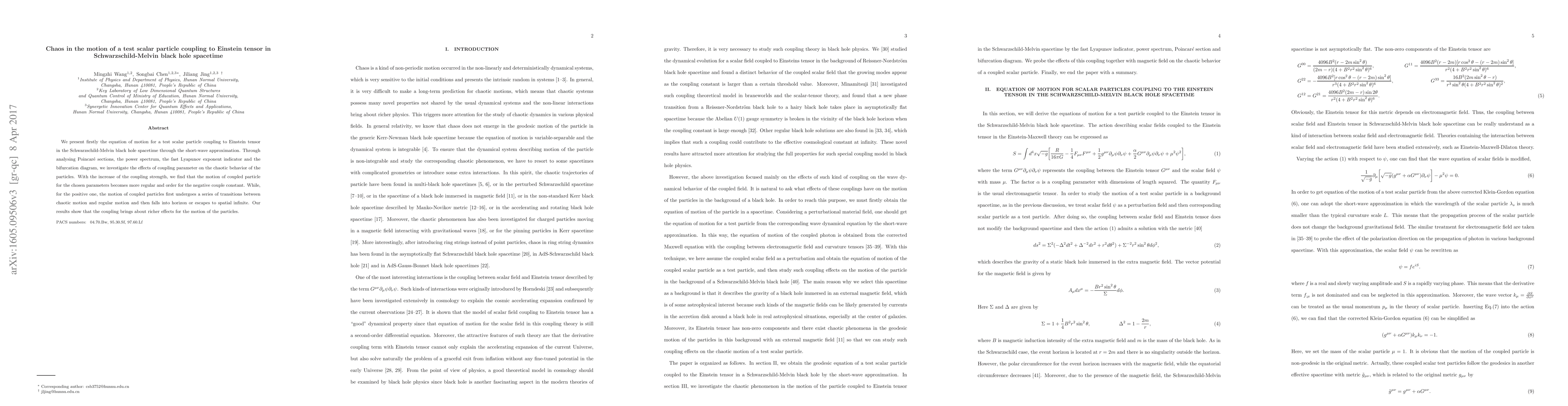 This paper investigates the chaotic motion of a test scalar particle in Schwarzschild-Melvin black hole spacetime, coupling it to the Einstein tensor. The study reveals that increased coupling strength leads to more regular motion for negative coupling constants, while positive coupling causes transitions between chaos and regularity before eventual escape or horizon fall.