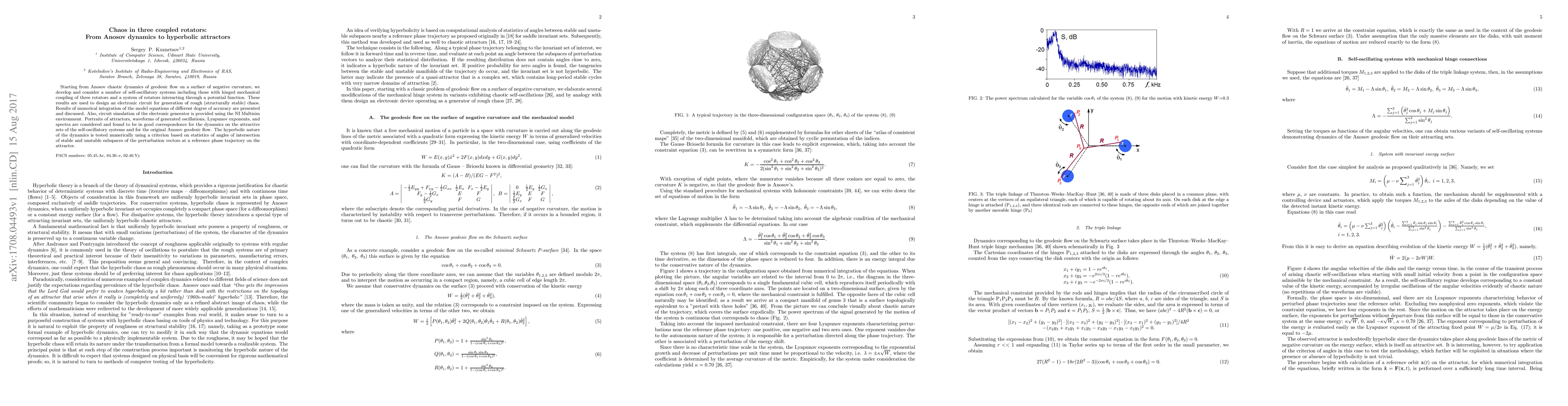 Starting from Anosov chaotic dynamics of geodesic flow on a surface of negative curvature, we develop and consider a number of self-oscillatory systems including those with hinged mechanical coupling of three rotators and a system of rotators interacting through a potential function. These results are used to design an electronic circuit for generation of rough (structurally stable) chaos. Results of numerical integration of the model equations of different degree of accuracy are presented and discussed. Also, circuit simulation of the electronic generator is provided using the NI Multisim environment. Portraits of attractors, waveforms of generated oscillations, Lyapunov exponents, and spectra are considered and found to be in good correspondence for the dynamics on the attractive sets of the self-oscillatory systems and for the original Anosov geodesic flow. The hyperbolic nature of the dynamics is tested numerically using a criterion based on statistics of angles of intersection of stable and unstable subspaces of the perturbation vectors at a reference phase trajectory on the attractor.