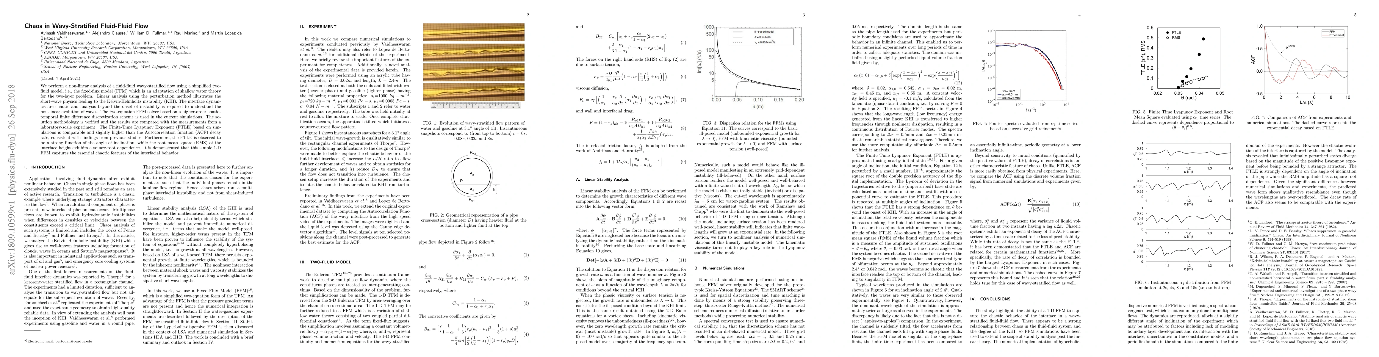 We perform a non-linear analysis of a fluid-fluid wavy-stratified flow using a simplified two-fluid model, i.e., the fixed-flux model (FFM) which is an adaptation of shallow water theory for the two-layer problem. Linear analysis using the perturbation method illustrates the short-wave physics leading to the Kelvin-Helmholtz instability (KHI). The interface dynamics are chaotic and analysis beyond the onset of instability is required to understand the non-linear evolution of waves. The two-equation FFM solver based on a higher-order spatio-temporal finite difference discretization scheme is used in the current simulations. The solution methodology is verified and the results are compared with the measurements from a laboratory-scale experiment. The Finite-Time Lyapunov Exponent (FTLE) based on simulations is comparable and slightly higher than the Autocorrelation function (ACF) decay rate, consistent with findings from previous studies. Furthermore, the FTLE is observed to be a strong function of the angle of inclination, while the root mean square (RMS) of the interface height exhibits a square-root dependence. It is demonstrated that this simple 1-D FFM captures the essential chaotic features of the interfacial behavior.