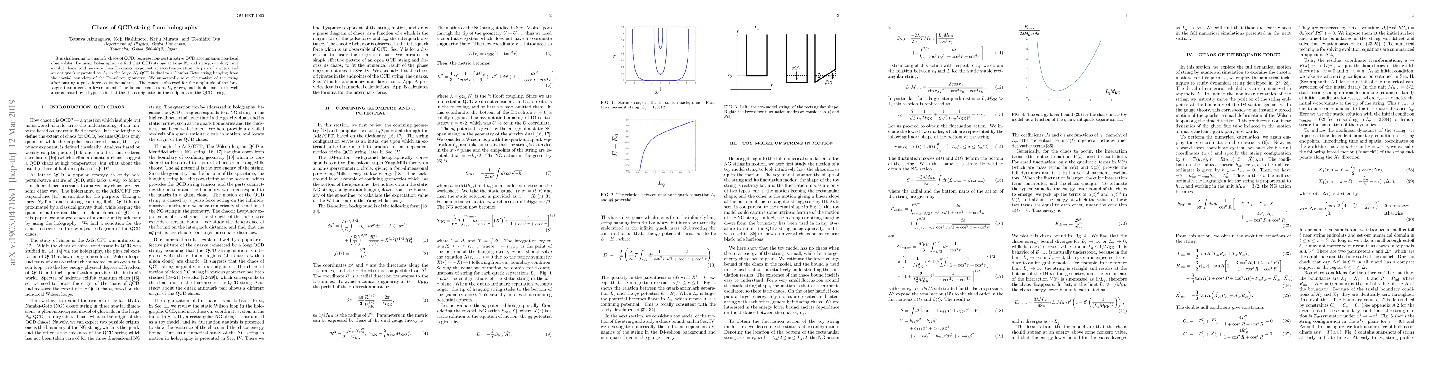 It is challenging to quantify chaos of QCD, because non-perturbative QCD accompanies non-local observables. By using holography, we find that QCD strings at large $N_c$ and strong coupling limit exhibit chaos, and measure their Lyapunov exponent at zero temperature. A pair of a quark and an antiquark separated by $L_q$ in the large $N_c$ QCD is dual to a Nambu-Goto string hanging from the spatial boundary of the D4-soliton geometry. We numerically solve the motion of the string after putting a pulse force on its boundaries. The chaos is observed for the amplitude of the force larger than a certain lower bound. The bound increases as $L_q$ grows, and its dependence is well approximated by a hypothesis that the chaos originates in the endpoints of the QCD string.