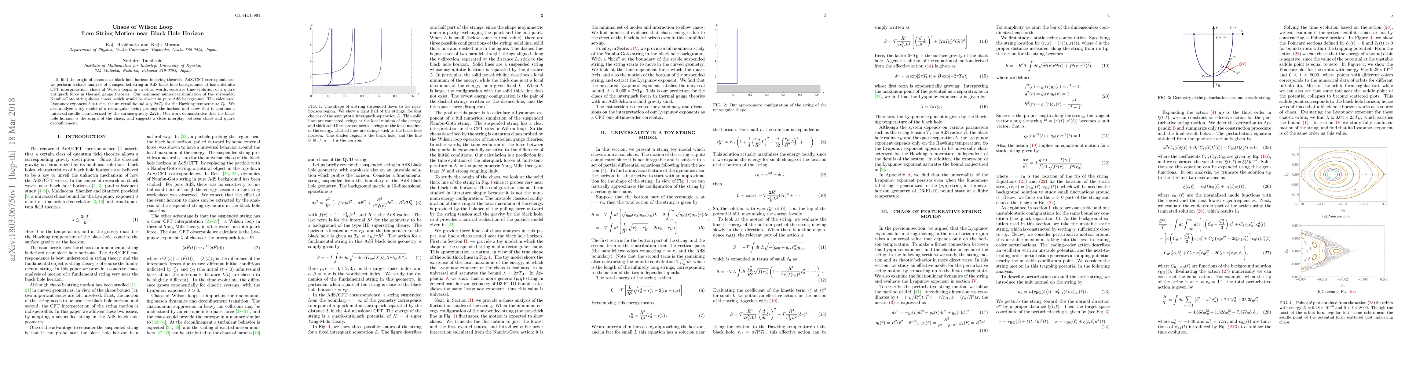 This paper investigates chaos near a black hole horizon in string theory, finding that the suspended string in AdS black hole backgrounds exhibits chaotic dynamics, interpreted as chaos in Wilson loops in thermal gauge theories. The Lyapunov exponent obeys the universal bound $\lambda \leq 2\pi T_{\rm H}$, indicating the black hole horizon as the origin of chaos and suggesting a connection to quark deconfinement.