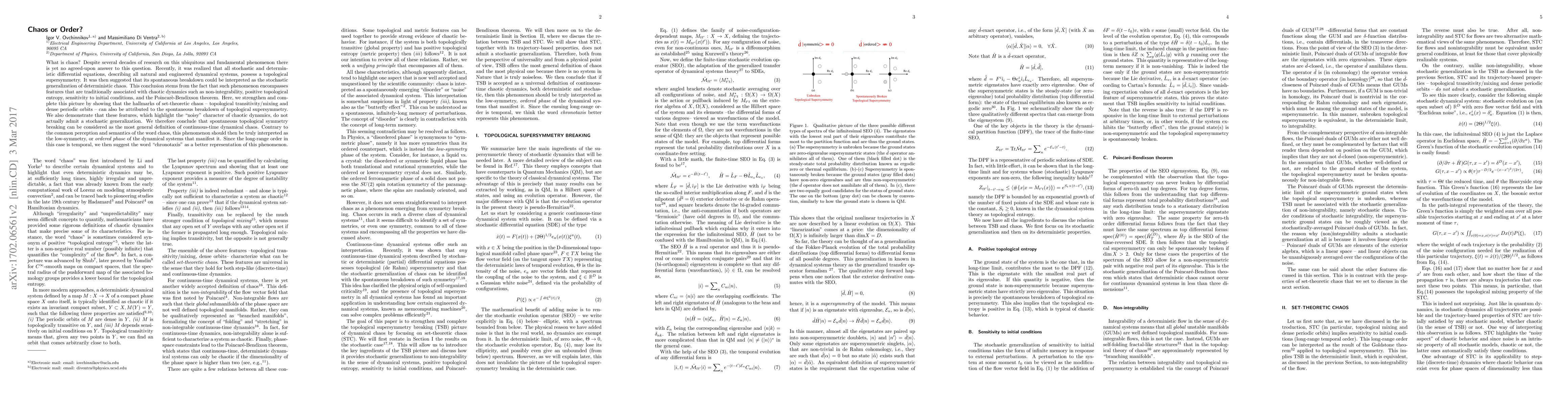 What is chaos? Despite several decades of research on this ubiquitous and fundamental phenomenon there is yet no agreed-upon answer to this question. Recently, it was realized that all stochastic and deterministic differential equations, describing all natural and engineered dynamical systems, possess a topological supersymmetry. It was then suggested that its spontaneous breakdown could be interpreted as the stochastic generalization of deterministic chaos. This conclusion stems from the fact that such phenomenon encompasses features that are traditionally associated with chaotic dynamics such as non-integrability, positive topological entropy, sensitivity to initial conditions, and the Poincare-Bendixson theorem. Here, we strengthen and complete this picture by showing that the hallmarks of set-theoretic chaos -- topological transitivity/mixing and dense periodic orbits -- can also be attributed to the spontaneous breakdown of topological supersymmetry. We also demonstrate that these features, which highlight the noisy character of chaotic dynamics, do not actually admit a stochastic generalization. We therefore conclude that spontaneous topological symmetry breaking can be considered as the most general definition of continuous-time dynamical chaos. Contrary to the common perception and semantics of the word "chaos", this phenomenon should then be truly interpreted as the low-symmetry, or ordered phase of the dynamical systems that manifest it. Since the long-range order in this case is temporal, we then suggest the word "chronotaxis" as a better representation of this phenomenon.