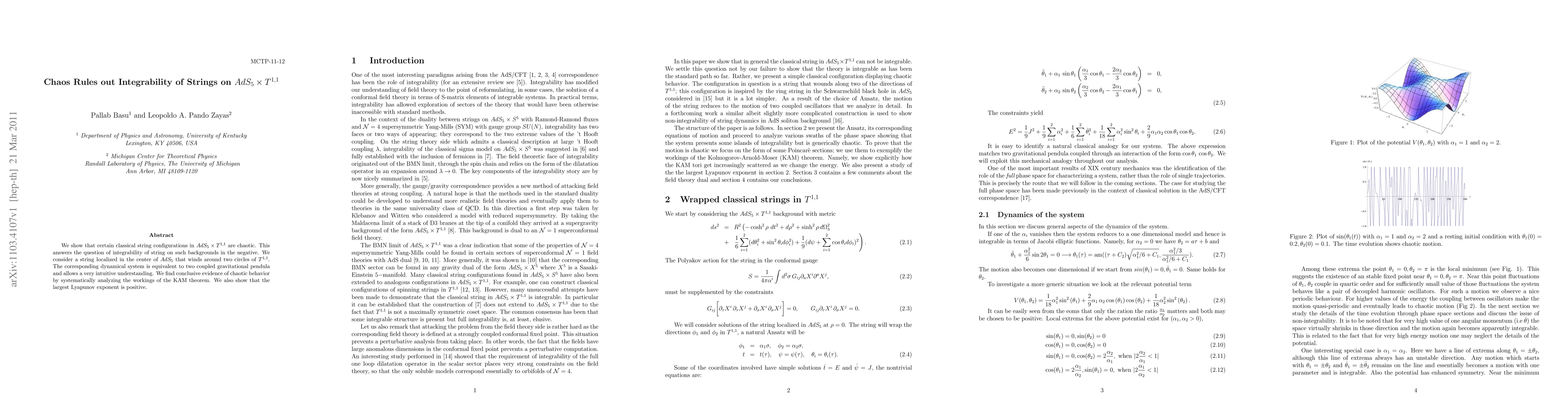 This paper demonstrates that classical string configurations in AdS_5 x T^{1,1} exhibit chaotic behavior, thereby ruling out integrability. The study focuses on strings localized in the center of AdS_5 winding around two circles of T^{1,1}, and uses the KAM theorem and positive largest Lyapunov exponent to confirm chaos.