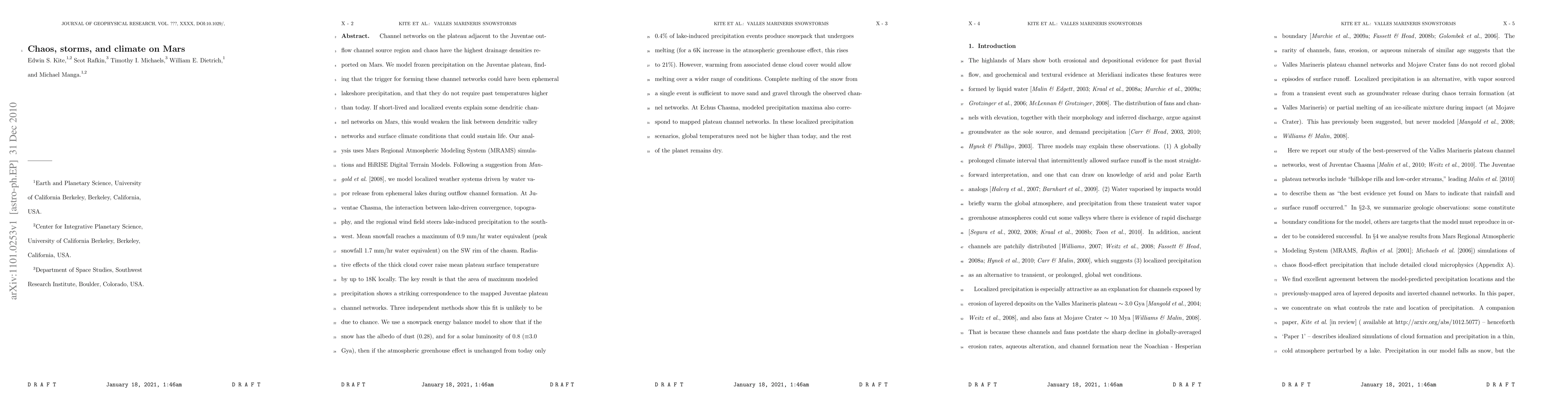 Channel networks on the plateau adjacent to Juventae Chasma have the highest drainage densities reported on Mars.We model frozen precipitation on the Juventae plateau,finding that the trigger for forming these channel networks could have been ephemeral lakeshore precipitation,and that they do not require past temperatures higher than today.If short-lived and localized events explain some dendritic channel networks on Mars, this would weaken the link between dendritic valley networks and surface climate conditions that could sustain life. Our analysis uses MRAMS simulations and HiRISE DTMs.We model localized weather systems driven by water vapor release from ephemeral lakes during outflow channel formation.At Juventae Chasma,mean snowfall reaches a maximum of 0.9mm/hr water equivalent on the SW rim of the chasm.Radiative effects of the thick cloud cover raise maximum (minimum, mean) plateau surface temperatures by up to 24K(9K, 17K)locally.The key result is that the area of maximum modeled precipitation shows a striking correspondence to the mapped Juventae plateau channel networks.Three independent methods show this fit is unlikely to be due to chance.We use a snowpack energy balance model to show that if the snow has the albedo of dust(0.28), and for a solar luminosity of 0.8($\equiv$3.0Gya), then if the atmospheric greenhouse effect is unchanged from(6K warmer than)today only 0.4%(21%)of lake-induced precipitation events produce snowpack that undergoes melting.However, warming from associated dense cloud cover would allow melting over a wider range of conditions.In these localized precipitation scenarios, global temperatures need not be higher than today, and the rest of the planet remains dry.