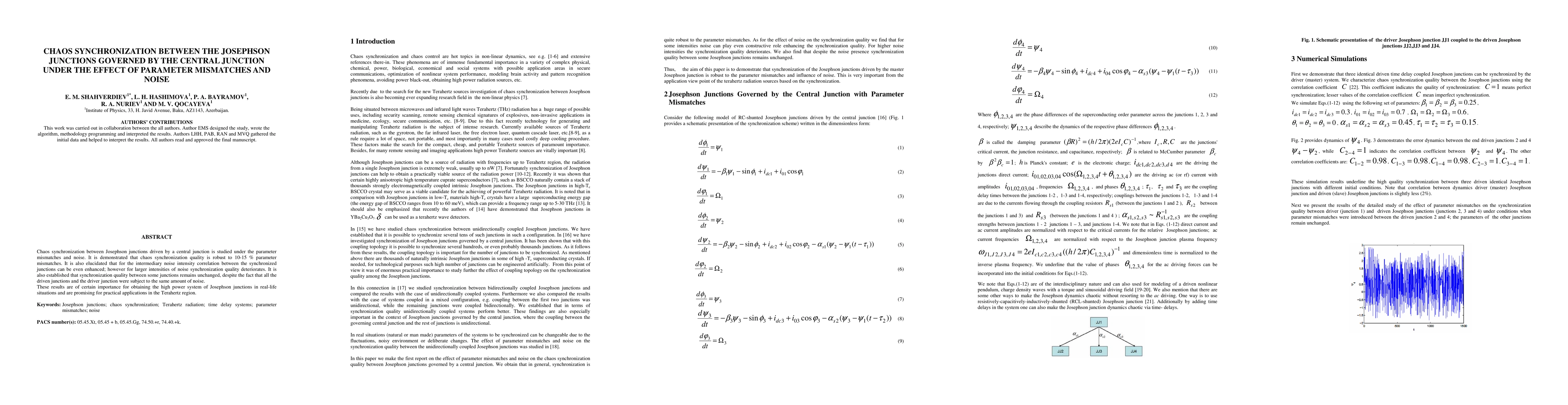 This paper investigates chaos synchronization among Josephson junctions influenced by a central junction, demonstrating robustness to 10-15% parameter mismatches. It finds that intermediate noise levels can enhance synchronization, while higher noise deteriorates it, and some junctions maintain synchronization despite uniform noise exposure. These findings are significant for developing high-power Josephson junction systems and have practical applications in the Terahertz region.