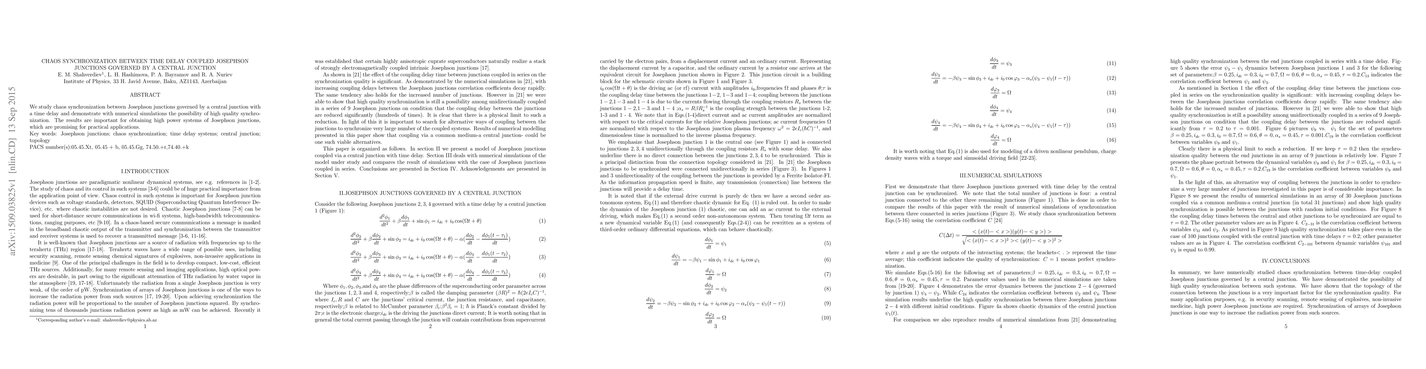 This paper investigates chaos synchronization in a network of time delay coupled Josephson junctions controlled by a central junction, showing high-quality synchronization through numerical simulations. The findings are significant for developing high-power systems of Josephson junctions with potential practical applications.