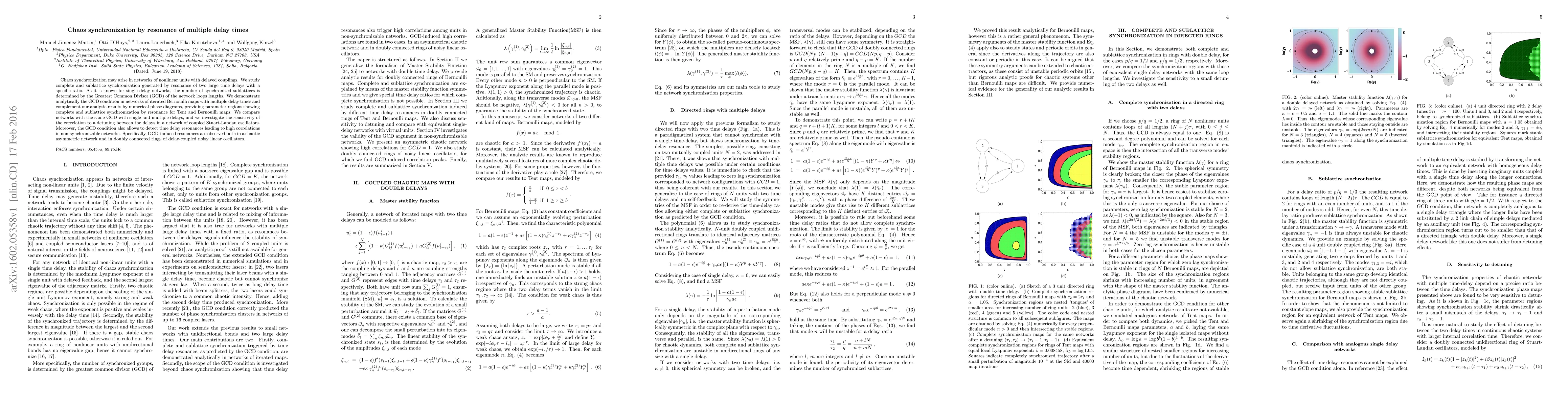 Chaos synchronization may arise in networks of nonlinear units with delayed couplings. We study complete and sublattice synchronization generated by resonance of two large time delays with a specific ratio. As it is known for single delay networks, the number of synchronized sublattices is determined by the Greatest Common Divisor (GCD) of the network loops lengths. We demonstrate analytically the GCD condition in networks of iterated Bernouilli maps with multiple delay times and complement our analytic results by numerical phase diagrams, providing parameter regions showing complete and sublattice synchronization by resonance for Tent and Bernouilli maps. We compare networks with the same GCD with single and multiple delays, and we investigate the sensitivity of the correlation to a detuning between the delays in a network of coupled Stuart-Landau oscillators. Moreover, the GCD condition also allows to detect time delay resonances leading to high correlations in non-synchronizable networks. Specifically, GCD-induced resonances are observed both in a chaotic asymmetric network and in doubly connected rings of delay-coupled noisy linear oscillators.