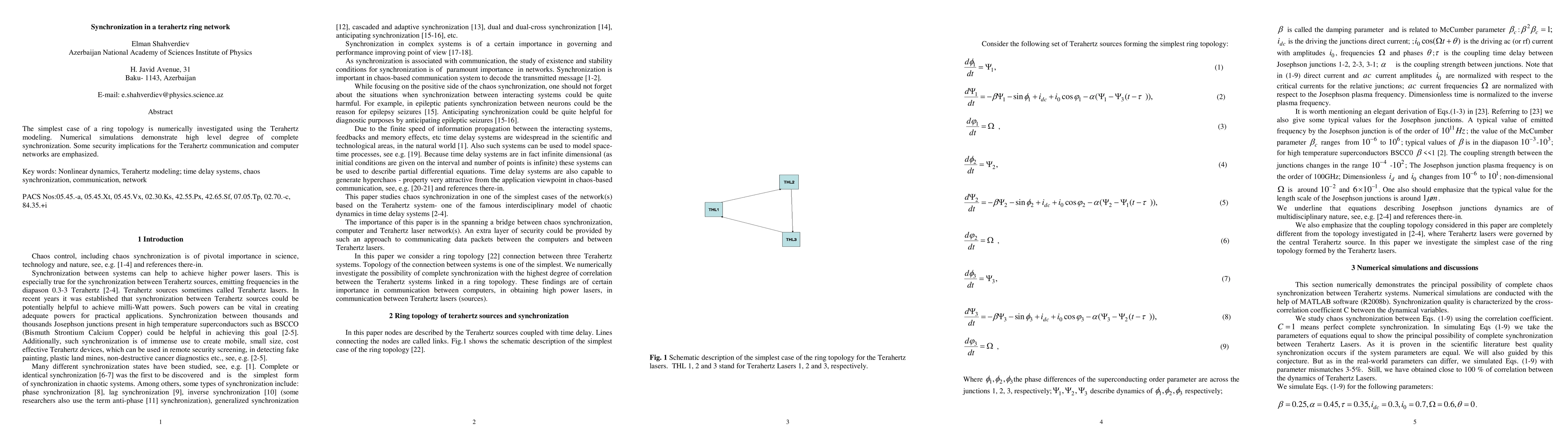 The simplest case of a ring topology is numerically investigated using the Terahertz modeling. Numerical simulations demonstrate high level degree of complete synchronization. Some security implications for the Terahertz communication and computer networks are emphasized.