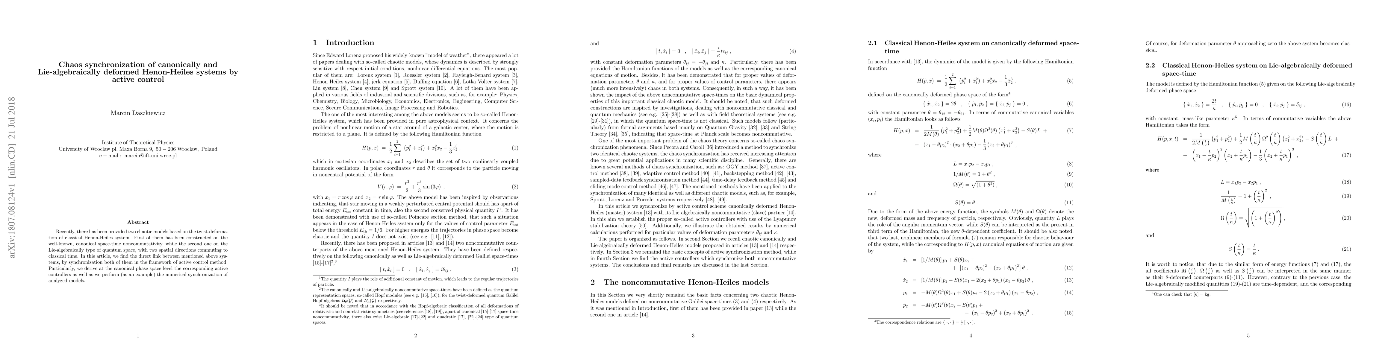 Recently, there has been provided two chaotic models based on the twist-deformation of classical Henon-Heiles system. First of them has been constructed on the well-known, canonical space-time noncommutativity, while the second one on the Lie-algebraically type of quantum space, with two spatial directions commuting to classical time. In this article, we find the direct link between mentioned above systems, by synchronization both of them in the framework of active control method. Particularly, we derive at the canonical phase-space level the corresponding active controllers as well as we perform (as an example) the numerical synchronization of analyzed models.