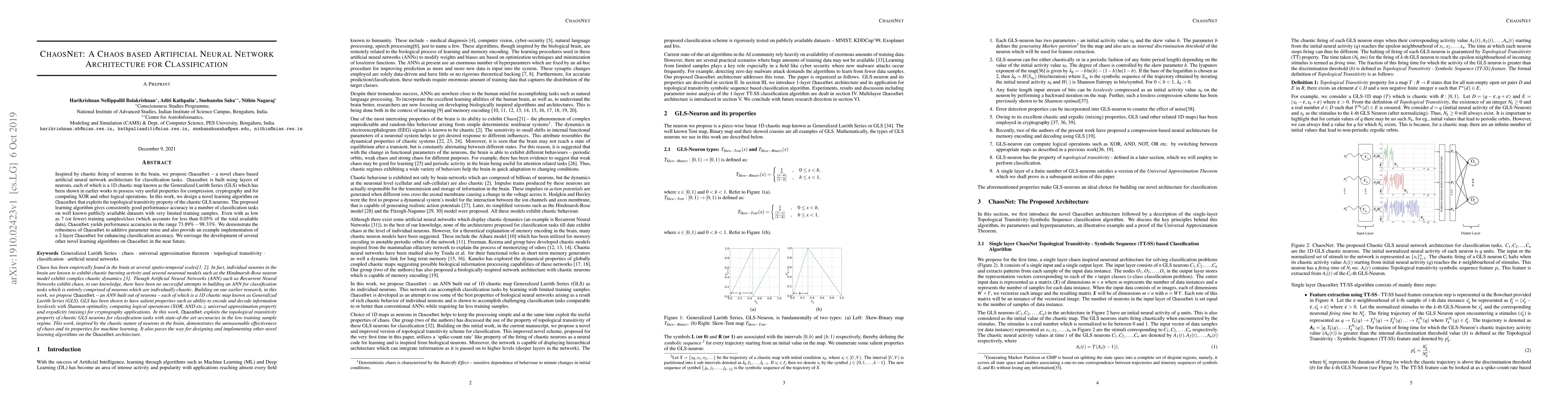 ChaosNet is a novel chaos-based neural network architecture utilizing 1D chaotic maps for classification tasks, achieving high accuracy with minimal training samples. It employs a learning algorithm exploiting the topological transitivity of chaotic neurons, demonstrating robustness and promising potential for future learning algorithm developments.