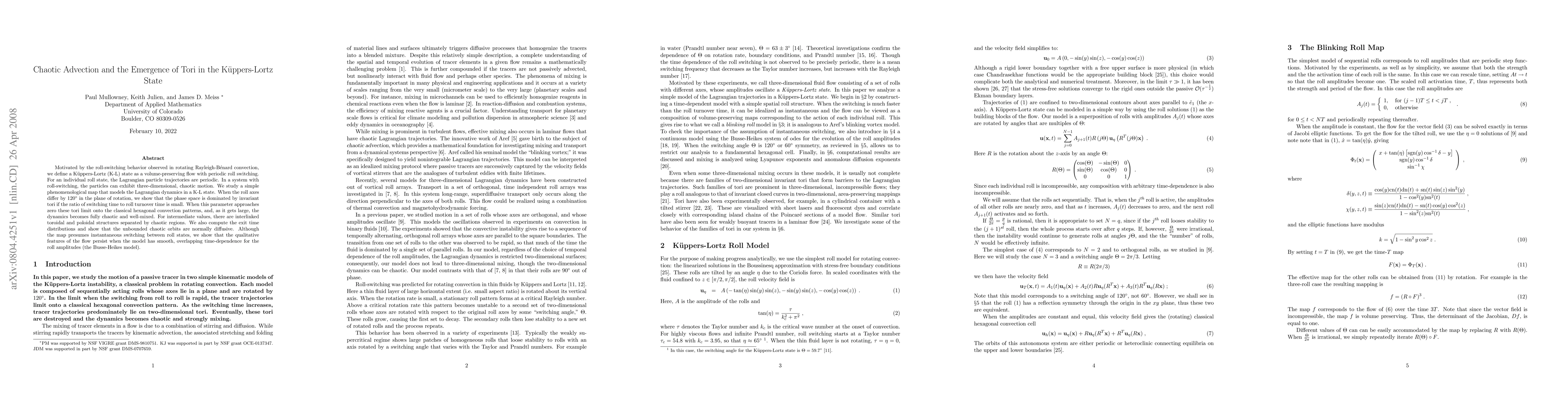 Motivated by the roll-switching behavior observed in rotating Rayleigh-B\'enard convection, we define a K\"uppers-Lortz (K-L) state as a volume-preserving flow with periodic roll switching. For an individual roll state, the Lagrangian particle trajectories are periodic. In a system with roll-switching, the particles can exhibit three-dimensional, chaotic motion. We study a simple phenomenological map that models the Lagrangian dynamics in a K-L state. When the roll axes differ by $120^{\circ}$ in the plane of rotation, we show that the phase space is dominated by invariant tori if the ratio of switching time to roll turnover time is small. When this parameter approaches zero these tori limit onto the classical hexagonal convection patterns, and, as it gets large, the dynamics becomes fully chaotic and well-mixed. For intermediate values, there are interlinked toroidal and poloidal structures separated by chaotic regions. We also compute the exit time distributions and show that the unbounded chaotic orbits are normally diffusive. Although the map presumes instantaneous switching between roll states, we show that the qualitative features of the flow persist when the model has smooth, overlapping time-dependence for the roll amplitudes (the Busse-Heikes model).
