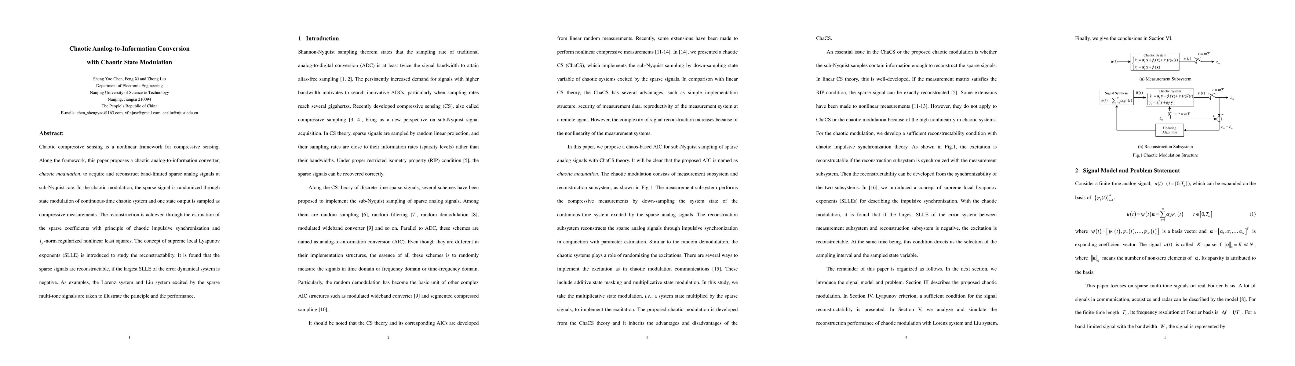 This paper proposes a chaotic analog-to-information converter using chaotic state modulation for compressive sensing of band-limited sparse signals at sub-Nyquist rates. The reconstruction leverages chaotic impulsive synchronization and Lp-norm regularized nonlinear least squares, with the supreme local Lyapunov exponent determining reconstructability.