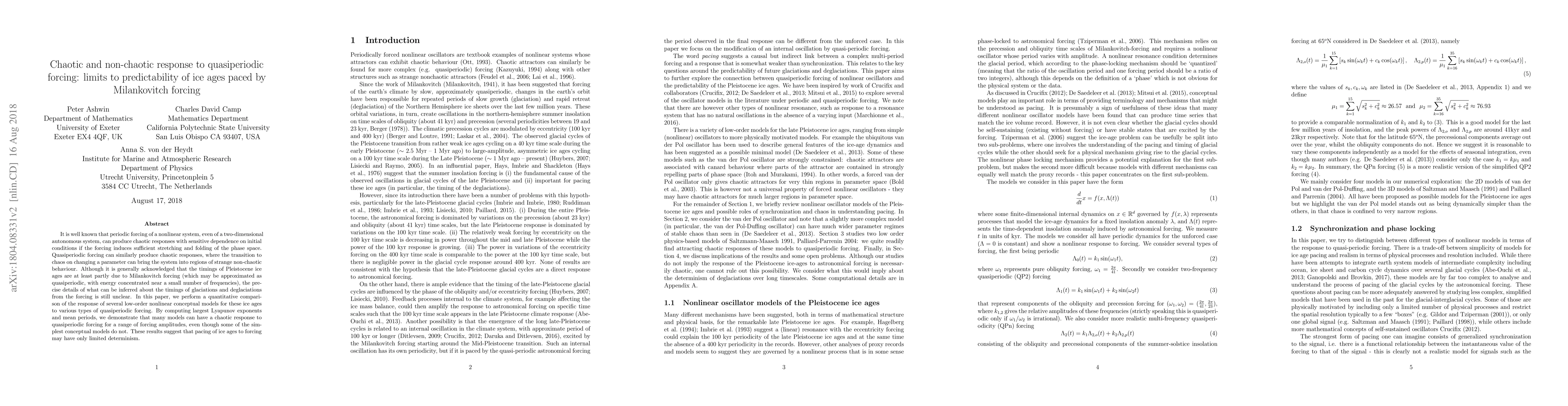 It is well known that periodic forcing of a nonlinear system, even of a two-dimensional autonomous system, can produce chaotic responses with sensitive dependence on initial conditions if the forcing induces sufficient stretching and folding of the phase space. Quasiperiodic forcing can similarly produce chaotic responses, where the transition to chaos on changing a parameter can bring the system into regions of strange non-chaotic behaviour. Although it is generally acknowledged that the timings of Pleistocene ice ages are at least partly due to Milankovitch forcing (which may be approximated as quasiperiodic, with energy concentrated near a small number of frequencies), the precise details of what can be inferred about the timings of glaciations and deglaciations from the forcing is still unclear. In this paper, we perform a quantitative comparison of the response of several low-order nonlinear conceptual models for these ice ages to various types of quasiperiodic forcing. By computing largest Lyapunov exponents and mean periods, we demonstrate that many models can have a chaotic response to quasiperiodic forcing for a range of forcing amplitudes, even though some of the simplest conceptual models do not. These results suggest that pacing of ice ages to forcing may have only limited determinism.