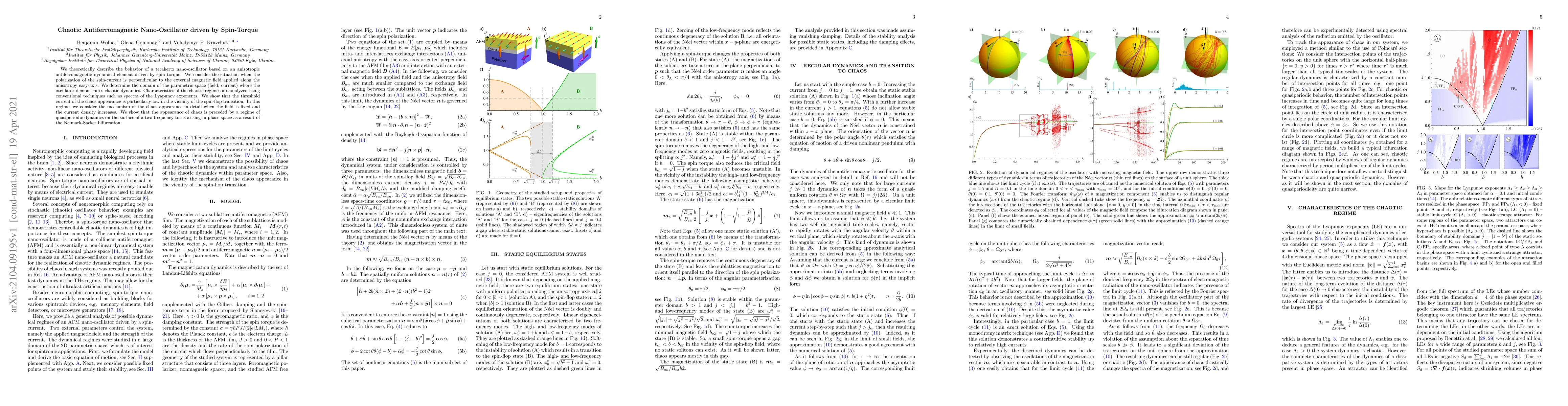 This paper theoretically explores a terahertz nano-oscillator utilizing an anisotropic antiferromagnetic element driven by spin-torque, identifying the conditions for chaotic dynamics. The study reveals that chaotic behavior emerges at low threshold currents near the spin-flop transition, preceded by quasiperiodic dynamics due to a Neimark-Sacker bifurcation.