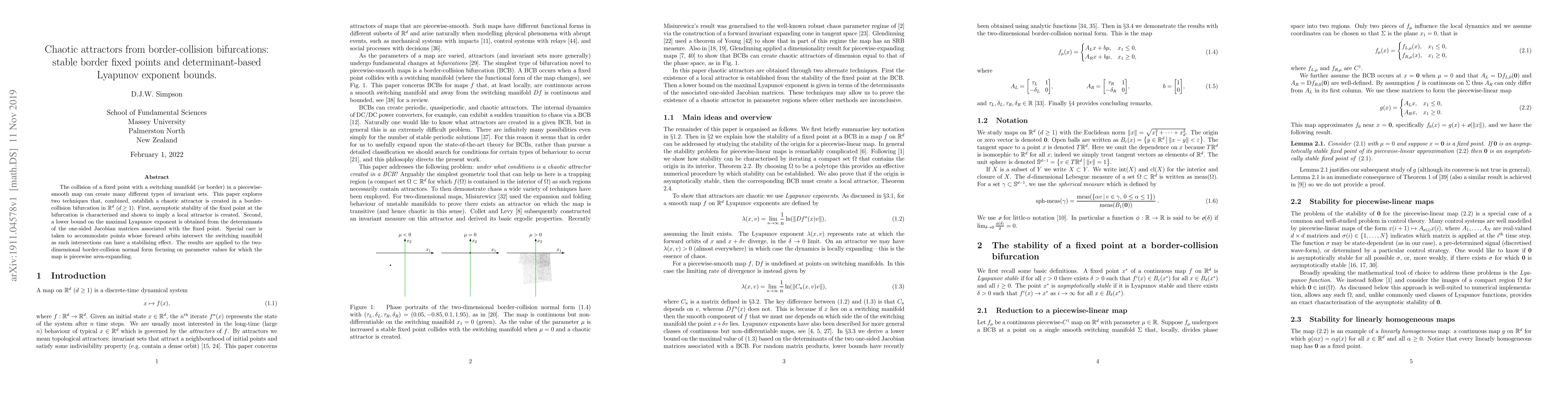 This paper investigates the creation of chaotic attractors via border-collision bifurcations in piecewise-smooth maps, demonstrating the local attractor formation through fixed point stability and providing a determinant-based lower bound for the maximal Lyapunov exponent, with special consideration for intersections with the switching manifold.