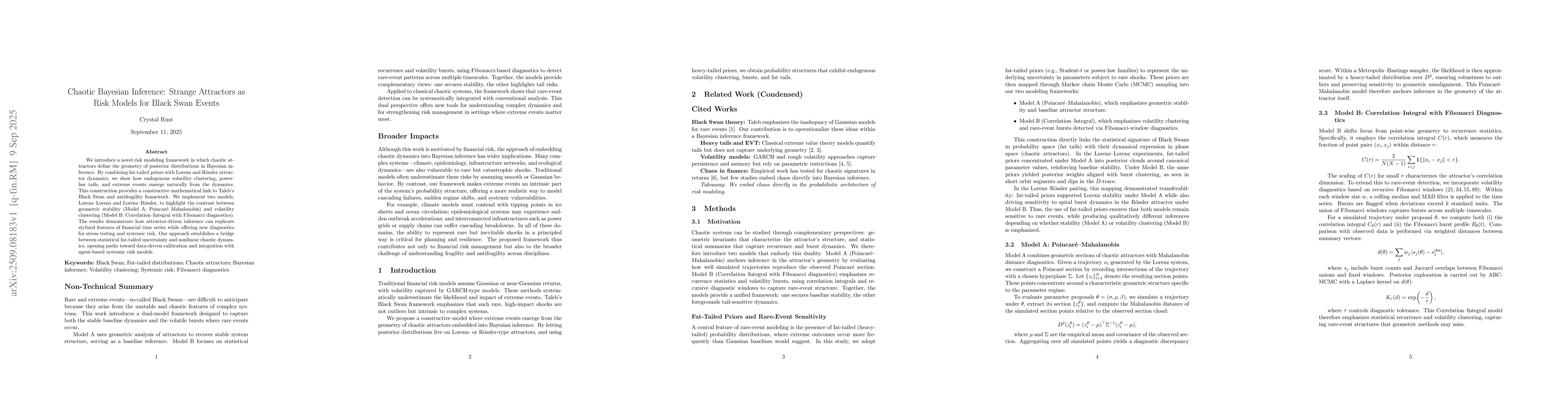 The paper introduces a dual-model framework combining chaotic dynamics (Lorenz and Rossler systems) with Bayesian inference, using heavy-tailed priors and diagnostic tools like Poincaré–Mahalanobis discrepancy and Fibonacci-based correlation integrals for risk modeling.