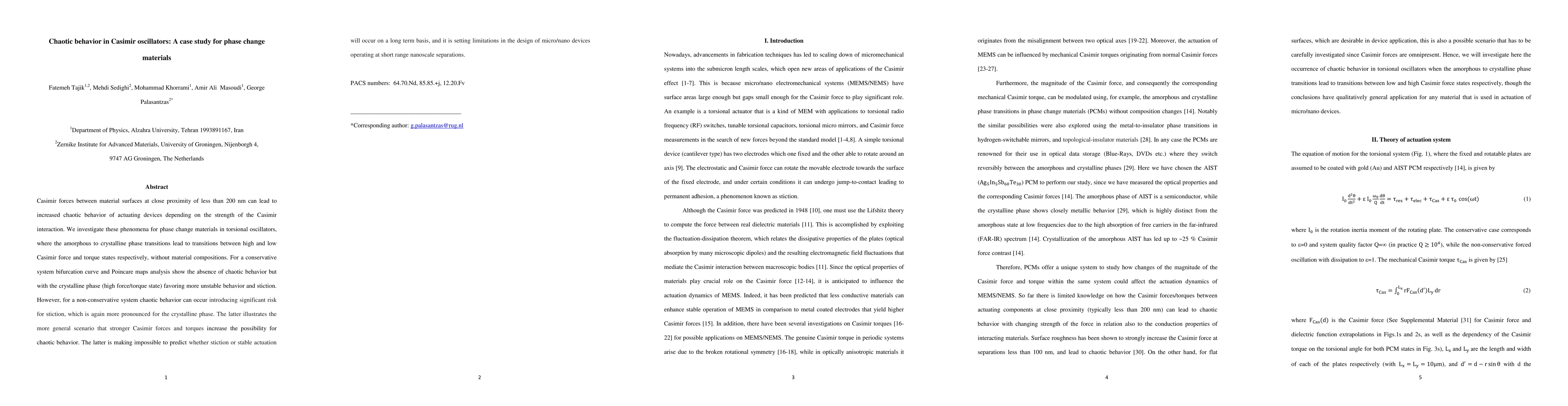 Casimir forces between material surfaces at close proximity of less than 200 nm can lead to increased chaotic behavior of actuating devices depending on the strength of the Casimir interaction. We investigate these phenomena for phase change materials in torsional oscillators, where the amorphous to crystalline phase transitions lead to transitions between high and low Casimir force and torque states respectively, without material compositions. For a conservative system bifurcation curve and Poincare maps analysis show the absence of chaotic behavior but with the crystalline phase (high force/torque state) favoring more unstable behavior and stiction. However, for a non-conservative system chaotic behavior can occur introducing significant risk for stiction, which is again more pronounced for the crystalline phase. The latter illustrates the more general scenario that stronger Casimir forces and torques increase the possibility for chaotic behavior. The latter is making impossible to predict whether stiction or stable actuation will occur on a long term basis, and it is setting limitations in the design of micro/nano devices operating at short range nanoscale separations.