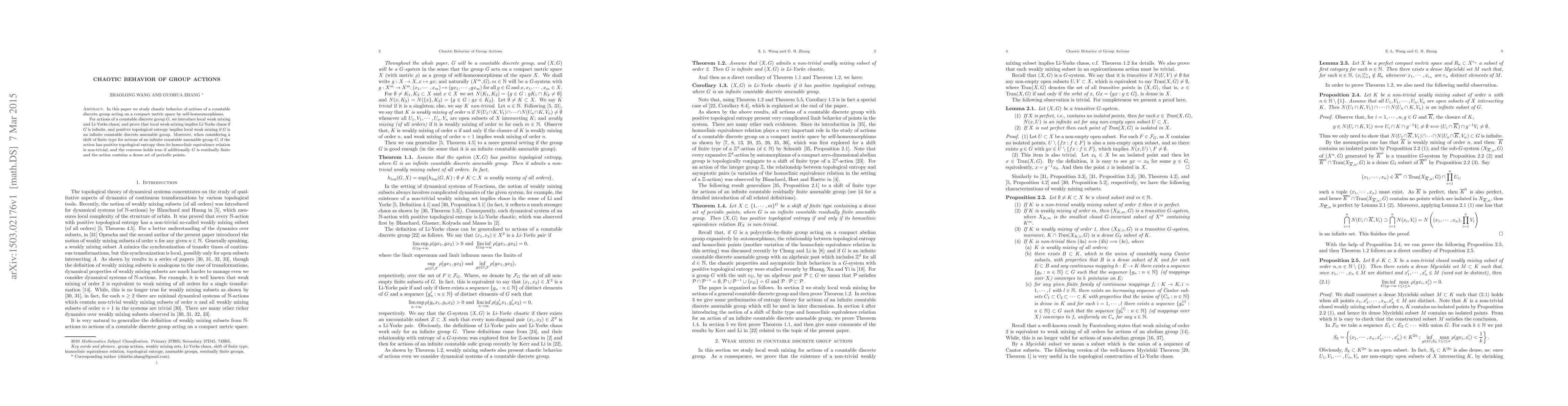 This paper investigates the chaotic behavior of actions by a countable discrete group on a compact metric space, introducing concepts like local weak mixing and Li-Yorke chaos. It demonstrates that local weak mixing implies Li-Yorke chaos for infinite groups, and positive topological entropy implies local weak mixing for infinite amenable groups. Additionally, it establishes that for amenable group actions with positive entropy, the homoclinic equivalence relation is non-trivial, and vice versa under extra conditions.