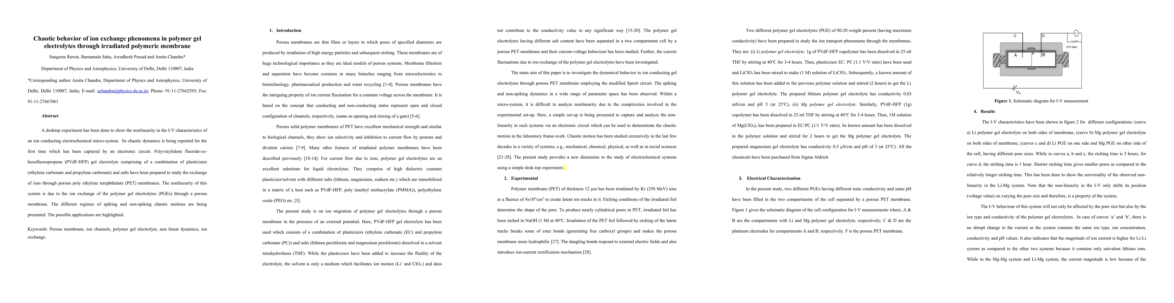 A desktop experiment has been done to show the nonlinearity in the I-V characteristics of an ion conducting electrochemical micro-system. Its chaotic dynamics is being reported for the first time which has been captured by an electronic circuit. Polyvinylidene fluoride-co-hexafluoropropene (PVdF-HFP) gel electrolyte comprising of a combination of plasticizers (ethylene carbonate and propylene carbonate) and salts have been prepared to study the exchange of ions through porous poly ethylene terephthalate (PET) membranes. The nonlinearity of this system is due to the ion exchange of the polymer gel electrolytes (PGEs) through a porous membrane. The different regimes of spiking and non-spiking chaotic motions are being presented. The possible applications are highlighted.