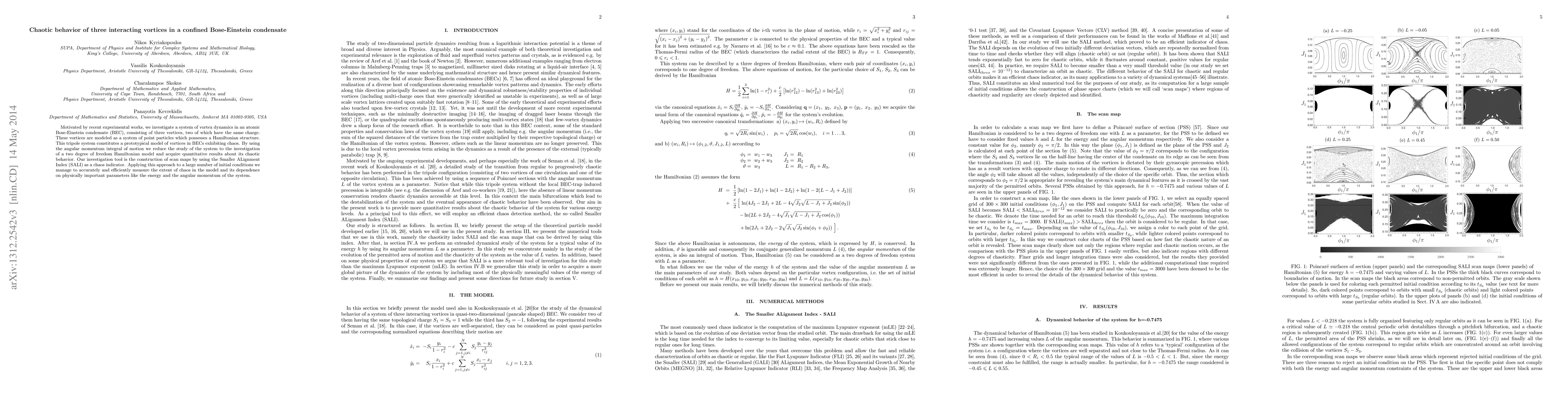 Motivated by recent experimental works, we investigate a system of vortex dynamics in an atomic Bose-Einstein condensate (BEC), consisting of three vortices, two of which have the same charge. These vortices are modeled as a system of point particles which possesses a Hamiltonian structure. This tripole system constitutes a prototypical model of vortices in BECs exhibiting chaos. By using the angular momentum integral of motion we reduce the study of the system to the investigation of a two degree of freedom Hamiltonian model and acquire quantitative results about its chaotic behavior. Our investigation tool is the construction of scan maps by using the Smaller ALignment Index (SALI) as a chaos indicator. Applying this approach to a large number of initial conditions we manage to accurately and efficiently measure the extent of chaos in the model and its dependence on physically important parameters like the energy and the angular momentum of the system.
