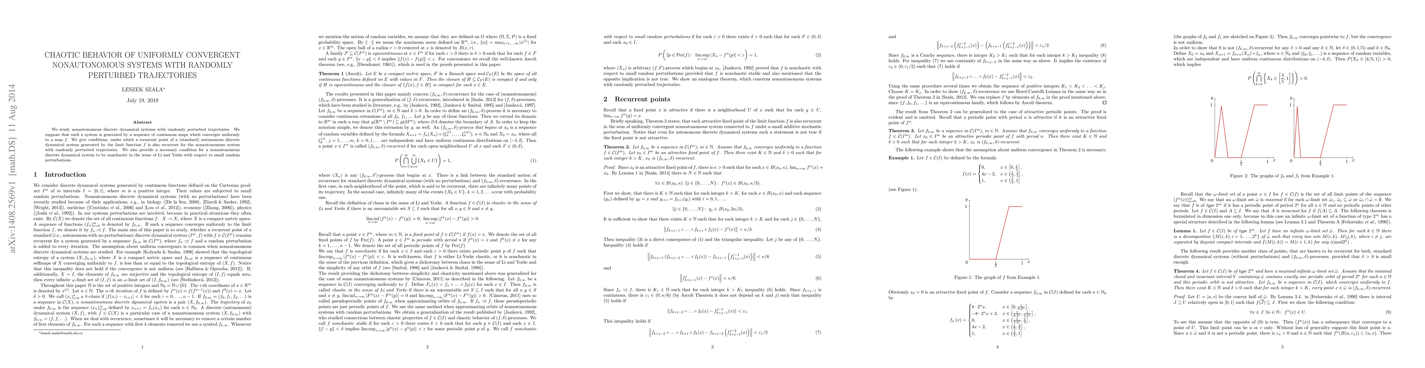 We study nonautonomous discrete dynamical systems with randomly perturbed trajectories. We suppose that such a system is generated by a sequence of continuous maps which converges uniformly to a map $f$. We give conditions, under which a recurrent point of a (standard) autonomous discrete dynamical system generated by the limit function $f$ is also recurrent for the nonautonomous system with randomly perturbed trajectories. We also provide a necessary condition for a nonautonomous discrete dynamical system to be nonchaotic in the sense of Li and Yorke with respect to small random perturbations.